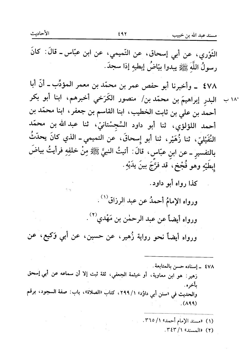 ٤٧٨ - وَأَخْبَرَنَا أَبُو حَفْصٍ عُمَرُ بْنُ مُحَمَّدِ بْنِ مَعْمَرٍ الْمُؤَدِّبُ، أَنَّ أَبَا الْبَدْرِ إِبْرَاهِيمَ بْنَ مُحَمَّدِ بْنِ مَنْصُورٍ الْكَرْخِيَّ أَخْبَرَهُمْ، أَبْنَا أَبُو بَكْرٍ أَحْمَدُ بْنُ عَلِيِّ بْنِ ثَابِتٍ الْخَطِيبُ، أَبْنَا الْقَاسِمُ بْنُ جَعْفَرٍ، أَبْنَا مُحَمَّدُ بْنُ أَحْمَدَ اللُّؤْلُؤِيُّ، ثَنَا أَبُو دَاوُدَ السِّجِسْتَانِيُّ، ثَنَا عَبْدُ اللهِ بْنُ مُحَمَّدٍ النُّفَيْلِيُّ، ثَنَا زُهَيْرٌ، ثَنَا أَبُو إِسْحَاقَ، عَنِ التَّمِيمِيِّ - الَّذِي كَانَ يُحَدِّثُ بِالتَّفْسِيرِ - عَنِ ابْنِ عَبَّاسٍ قَالَ: «أَتَيْتُ النَّبِيَّ صَلَّى اللهُ عَلَيْهِ وَسَلَّمَ مِنْ خَلْفِهِ فَرَأَيْتُ بَيَاضَ إِبْطَيْهِ وَهُوَ مُجَخٍّ، قَدْ فَرَّجَ بَيْنَ يَدَيْهِ».