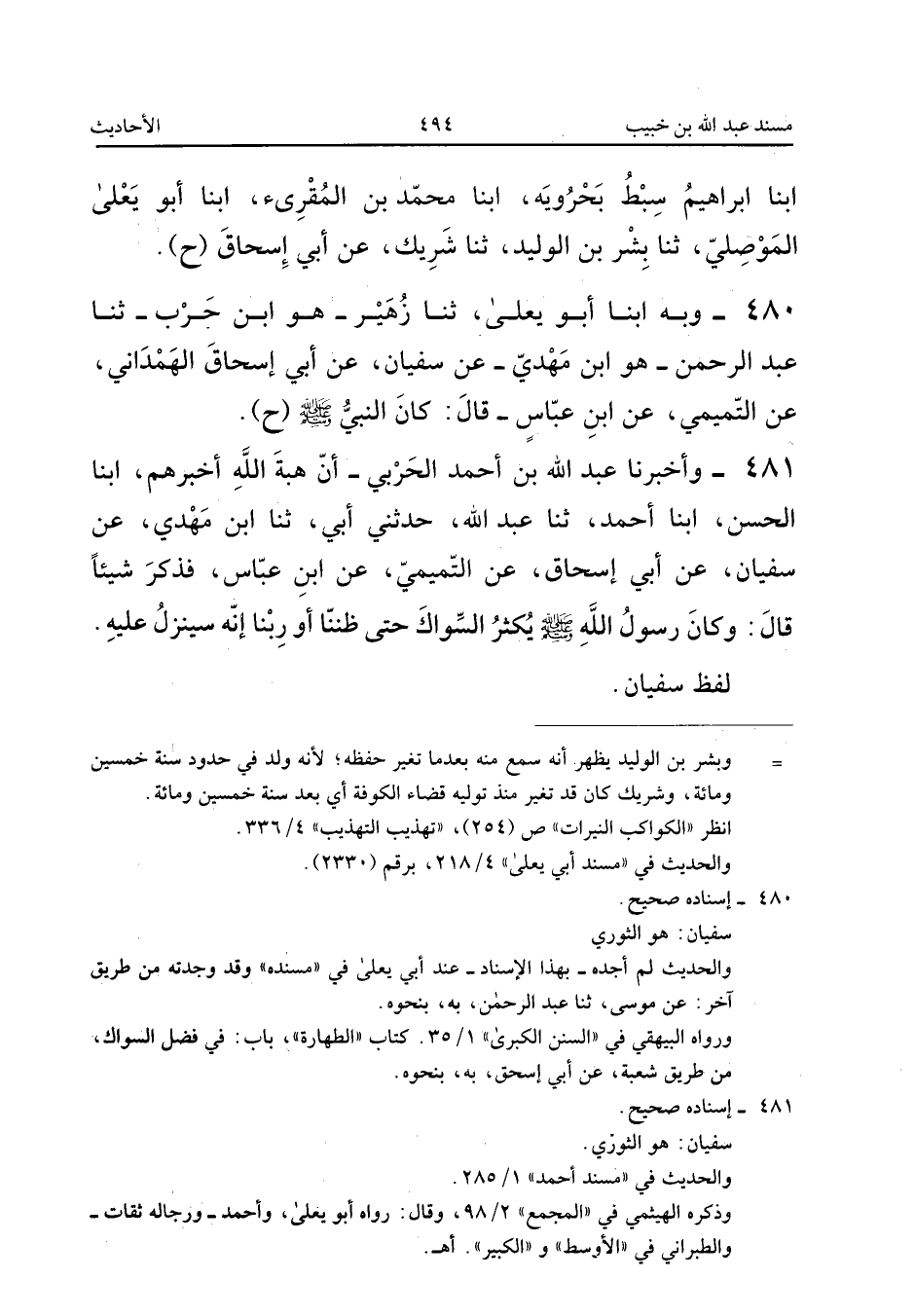 ٤٨٠ - وَبِهِ، أَبْنَا أَبُو يَعْلَى، ثَنَا زُهَيْرٌ - هُوَ ابْنُ حَرْبٍ - ثَنَا عَبْدُ الرَّحْمَنِ - هُوَ ابْنُ مَهْدِيٍّ - عَنْ سُفْيَانَ، عَنْ أَبِي إِسْحَاقَ الْهَمْدَانِيِّ، عَنِ التَّمِيمِيِّ، عَنِ ابْنِ عَبَّاسٍ قَالَ: كَانَ النَّبِيُّ صَلَّى اللهُ عَلَيْهِ وَسَلَّمَ (ح).