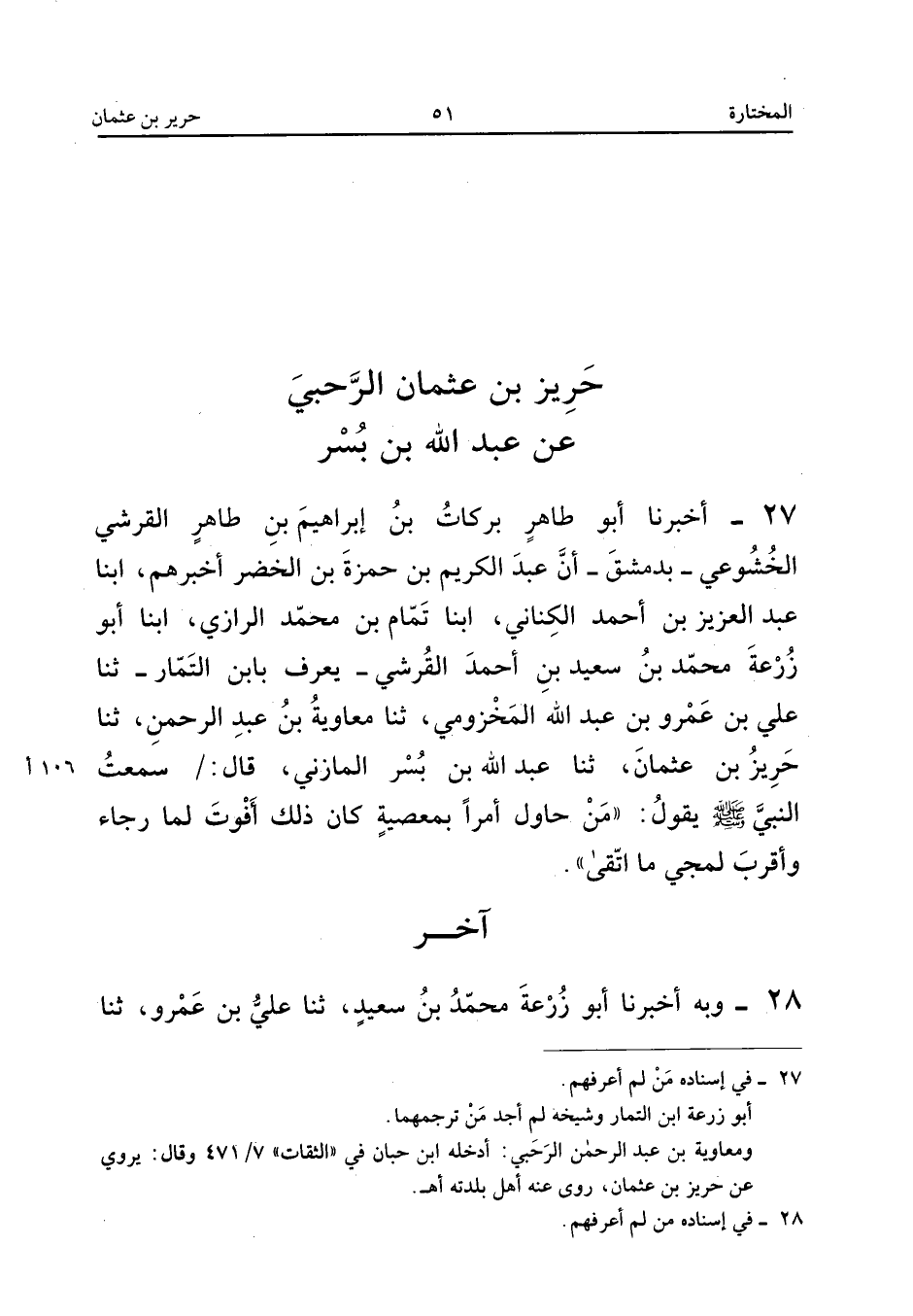 ٢٧ - أَخْبَرَنَا أَبُو طَاهِرٍ بَرَكَاتُ بْنُ إِبْرَاهِيمَ بْنِ طَاهِرٍ الْقُرَشِيُّ الْخُشُوعِيُّ بِدِمَشْقَ، أَنَّ عَبْدَ الْكَرِيمِ بْنَ حَمْزَةَ بْنِ الْخَضِرِ أَخْبَرَهُمْ، أَبْنَا عَبْدُ الْعَزِيزِ بْنُ أَحْمَدَ الْكِنَانِيُّ، أَبْنَا تَمَّامُ بْنُ مُحَمَّدٍ الرَّازِيُّ، أَبْنَا أَبُو زُرْعَةَ مُحَمَّدُ بْنُ سَعِيدِ بْنِ أَحْمَدَ الْقُرَشِيُّ - يُعْرَفُ بِابْنِ التَّمَّارِ - ثَنَا عَلِيُّ بْنُ عَمْرِو بْنِ عَبْدِ اللهِ الْمَخْزُومِيُّ، ثَنَا مُعَاوِيَةُ بْنُ عَبْدِ الرَّحْمَنِ، ثَنَا حَرِيزُ بْنُ عُثْمَانَ، ثَنَا عَبْدُ اللهِ بْنُ بُسْرٍ الْمَازِنِيُّ، قَالَ: سَمِعْتُ النَّبِيَّ صَلَّى اللهُ عَلَيْهِ وَسَلَّمَ يَقُولُ: «مَنْ حَاوَلَ أَمْرًا بِمَعْصِيَةٍ كَانَ ذَلِكَ أَفْوَتَ لِمَا رَجَا وَأَقْرَبَ لِمَجِيءِ مَا اتَّقَى».