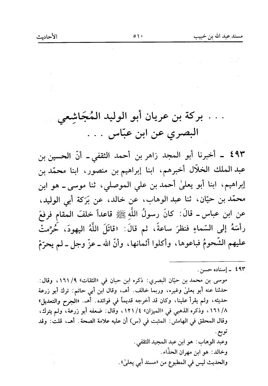 ٤٩٣ - أَخْبَرَنَا أَبُو الْمَجْدِ زَاهِرُ بْنُ أَحْمَدَ الثَّقَفِيُّ، أَنَّ الْحُسَيْنَ بْنَ عَبْدِ الْمَلِكِ الْخَلَّالَ أَخْبَرَهُمْ، أَبْنَا إِبْرَاهِيمُ بْنُ مَنْصُورٍ، أَبْنَا مُحَمَّدُ بْنُ إِبْرَاهِيمَ، أَبْنَا أَبُو يَعْلَى أَحْمَدُ بْنُ عَلِيٍّ الْمَوْصِلِيُّ، ثَنَا مُوسَى - هُوَ ابْنُ مُحَمَّدِ بْنِ حَيَّانَ - ثَنَا عَبْدُ الْوَهَّابِ، عَنْ خَالِدٍ، عَنْ بَرَكَةَ أَبِي الْوَلِيدِ، عَنِ ابْنِ عَبَّاسٍ قَالَ: «كَانَ رَسُولُ اللهِ صَلَّى اللهُ عَلَيْهِ وَسَلَّمَ قَاعِدًا خَلْفَ الْمَقَامِ فَرَفَعَ رَأْسَهُ إِلَى السَّمَاءِ فَنَظَرَ سَاعَةً ثُمَّ قَالَ: قَاتَلَ اللهُ الْيَهُودَ حُرِّمَتْ عَلَيْهِمُ الشُّحُومُ فَبَاعُوهَا وَأَكَلُوا أَثْمَانَهَا، وَإِنَّ اللهَ عَزَّ وَجَلَّ لَمْ يُحَرِّمْ