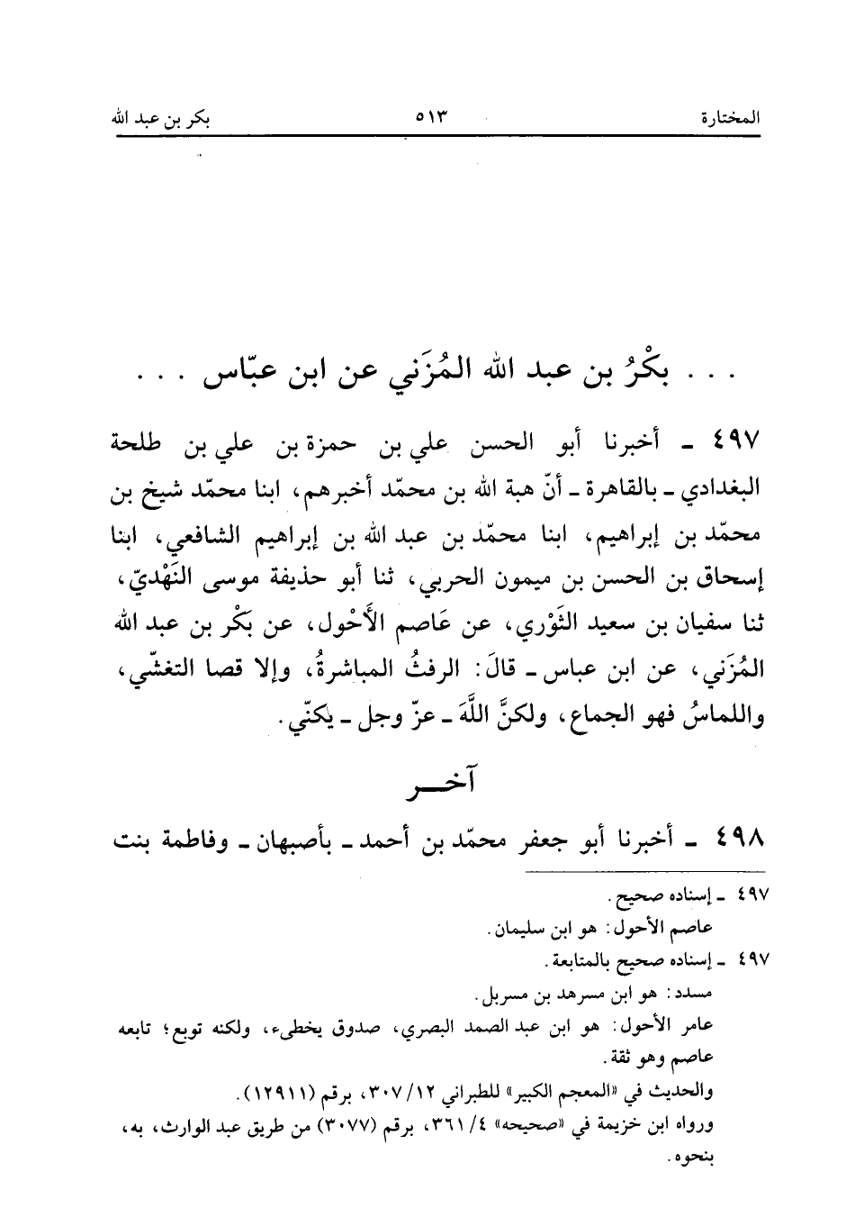 ٤٩٧ - أَخْبَرَنَا أَبُو الْحَسَنِ عَلِيُّ بْنُ حَمْزَةَ بْنِ عَلِيِّ بْنِ طَلْحَةَ الْبَغْدَادِيُّ - بِالْقَاهِرَةِ - أَنَّ هِبَةَ اللهِ بْنَ مُحَمَّدٍ أَخْبَرَهُمْ، أَبْنَا مُحَمَّدٌ شَيْخُ بْنُ مُحَمَّدِ بْنِ إِبْرَاهِيمَ، أَبْنَا مُحَمَّدُ بْنُ عَبْدِ اللهِ بْنِ إِبْرَاهِيمَ الشَّافِعِيُّ، أَبْنَا إِسْحَاقُ بْنُ الْحَسَنِ بْنِ مَيْمُونٍ الْحَرْبِيُّ، ثَنَا أَبُو حُذَيْفَةَ مُوسَى النَّهْدِيُّ، ثَنَا سُفْيَانُ بْنُ سَعِيدٍ الثَّوْرِيُّ، عَنْ عَاصِمٍ الْأَحْوَلِ، عَنْ بَكْرِ بْنِ عَبْدِ اللهِ الْمُزَنِيِّ، عَنِ ابْنِ عَبَّاسٍ قَالَ: «الرَّفَثُ: الْمُبَاشَرَةُ، وَالْإِفْضَاءُ: التَّغَشِّي، وَاللِّمَاسُ فَهُوَ الْجِمَاعُ، وَلَكِنَّ اللهَ عَزَّ وَجَلَّ يُكَنِّي».