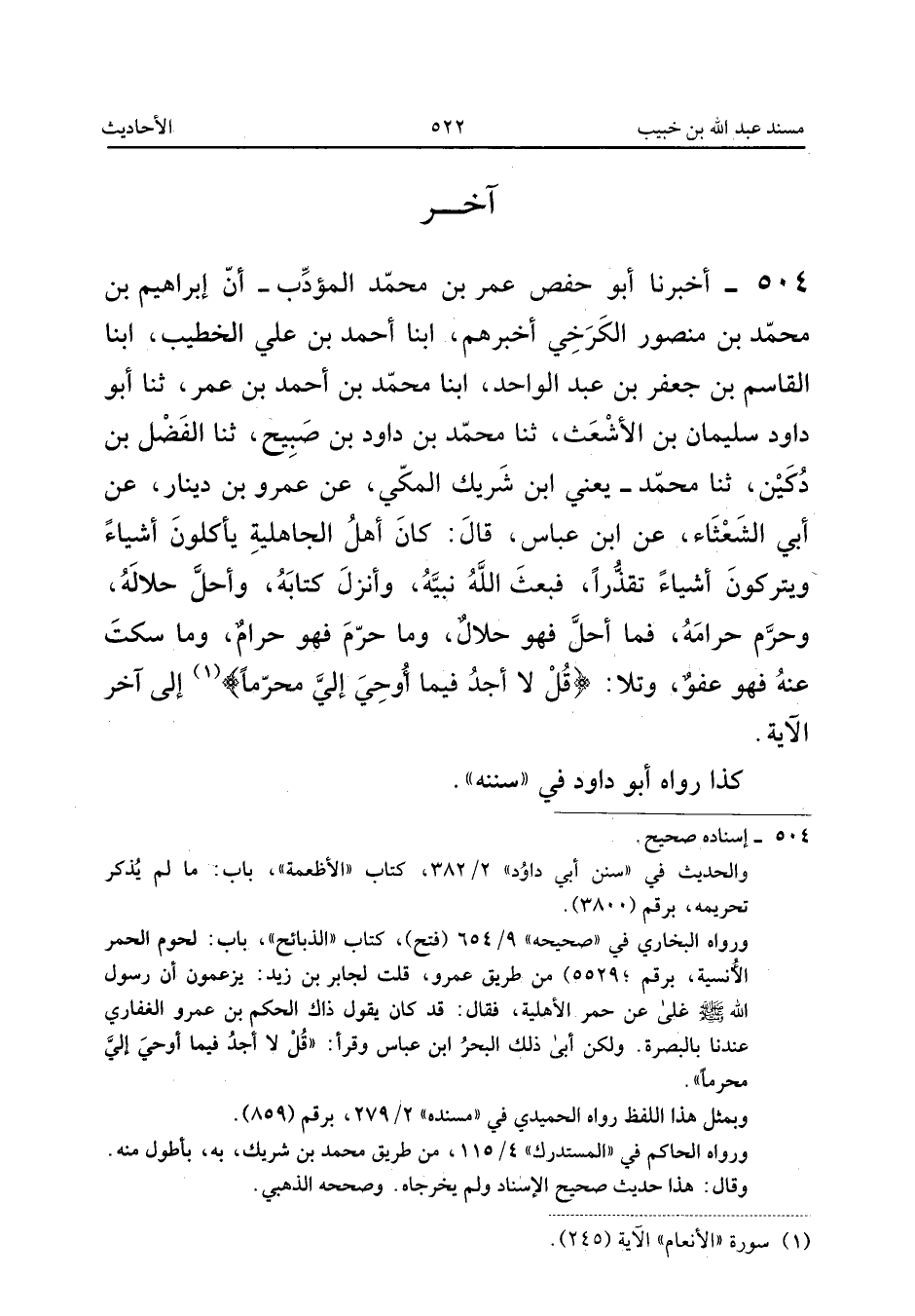 ٥٠٤ - أَخْبَرَنَا أَبُو حَفْصٍ عُمَرُ بْنُ مُحَمَّدٍ الْمُؤَدِّبُ، أَنَّ إِبْرَاهِيمَ بْنَ مُحَمَّدِ بْنِ مَنْصُورٍ الْكَرْخِيَّ أَخْبَرَهُمْ، أَبْنَا أَحْمَدُ بْنُ عَلِيٍّ الْخَطِيبُ، أَبْنَا الْقَاسِمُ بْنُ جَعْفَرِ بْنِ عَبْدِ الْوَاحِدِ، أَبْنَا مُحَمَّدُ بْنُ أَحْمَدَ بْنِ عُمَرَ، ثَنَا أَبُو دَاوُدَ سُلَيْمَانُ بْنُ الْأَشْعَثِ، ثَنَا مُحَمَّدُ بْنُ دَاوُدَ بْنِ صُبَيْحٍ، ثَنَا الْفَضْلُ بْنُ دُكَيْنٍ، ثَنَا مُحَمَّدٌ - يَعْنِي ابْنَ شَرِيكٍ الْمَكِّيَّ - عَنْ عَمْرِو بْنِ دِينَارٍ، عَنْ أَبِي الشَّعْثَاءِ، عَنِ ابْنِ عَبَّاسٍ قَالَ: «كَانَ أَهْلُ الْجَاهِلِيَّةِ يَأْكُلُونَ أَشْيَاءَ وَيَتْرُكُونَ أَشْيَاءَ تَقَذُّرًا، فَبَعَثَ اللهُ نَبِيَّهُ وَأَنْزَلَ كِتَابَهُ وَأَحَلَّ حَلَالَهُ وَحَرَّمَ حَرَامَهُ، فَمَا أَحَلَّ فَهُوَ حَلَالٌ وَمَا حَرَّمَ فَهُوَ حَرَامٌ، وَمَا سَكَتَ عَنْهُ فَهُوَ عَفْوٌ، وَتَلَا: {قُلْ لا أَجِدُ فِي مَا أُوحِيَ إِلَيَّ مُحَرَّمًا} إِلَى آخِرِ الْآيَةِ».