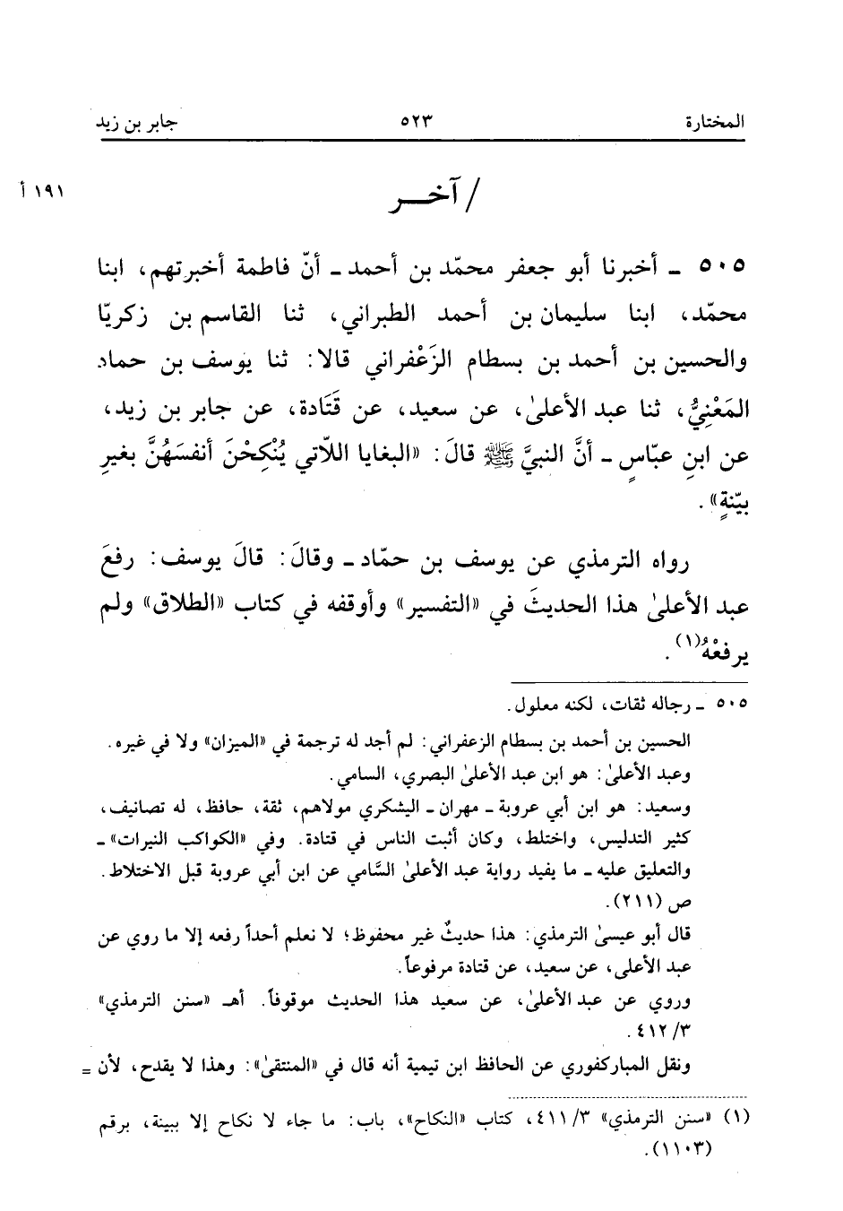 ٥٠٥ - أَخْبَرَنَا أَبُو جَعْفَرٍ مُحَمَّدُ بْنُ أَحْمَدَ، أَنَّ فَاطِمَةَ أَخْبَرَتْهُمْ، أَبْنَا مُحَمَّدٌ، أَبْنَا سُلَيْمَانُ بْنُ أَحْمَدَ الطَّبَرَانِيُّ، ثَنَا الْقَاسِمُ بْنُ زَكَرِيَّا وَالْحُسَيْنُ بْنُ أَحْمَدَ بْنِ بَسْطَامٍ الزَّعْفَرَانِيُّ قَالَا: ثَنَا يُوسُفُ بْنُ حَمَّادٍ الْمَعْنِيُّ، ثَنَا عَبْدُ الْأَعْلَى، عَنْ سَعِيدٍ، عَنْ قَتَادَةَ، عَنْ جَابِرِ بْنِ زَيْدٍ، عَنِ ابْنِ عَبَّاسٍ: أَنَّ النَّبِيَّ صَلَّى اللهُ عَلَيْهِ وَسَلَّمَ قَالَ: «الْبَغَايَا اللَّاتِي يُنْكِحْنَ أَنْفُسَهُنَّ بِغَيْرِ بَيِّنَةٍ».