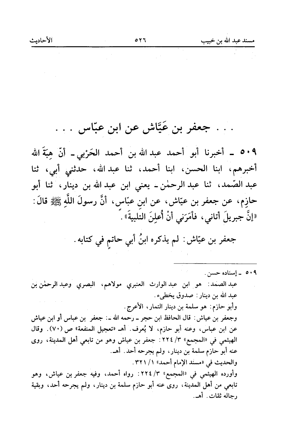 ٥٠٩ - أَخْبَرَنَا أَبُو أَحْمَدَ عَبْدُ اللهِ بْنُ أَحْمَدَ الْحَرْبِيُّ (¬١)، أَنَّ هِبَةَ اللهِ أَخْبَرَهُمْ، أَبْنَا الْحَسَنُ، أَبْنَا أَحْمَدُ، ثَنَا عَبْدُ اللهِ، حَدَّثَنِي أَبِي، ثَنَا عَبْدُ الصَّمَدِ، ثَنَا عَبْدُ الرَّحْمَنِ - يَعْنِي ابْنَ عَبْدِ اللهِ بْنِ دِينَارٍ، ثَنَا أَبُو حَازِمٍ، عَنْ جَعْفَرِ بْنِ عَيَّاشٍ، عَنِ ابْنِ عَبَّاسٍ: أَنَّ رَسُولَ اللهِ صَلَّى اللهُ عَلَيْهِ وَسَلَّمَ قَالَ: «إِنَّ جِبْرِيلَ أَتَانِي فَأَمَرَنِي أَنْ أُعْلِنَ التَّلْبِيَةَ».