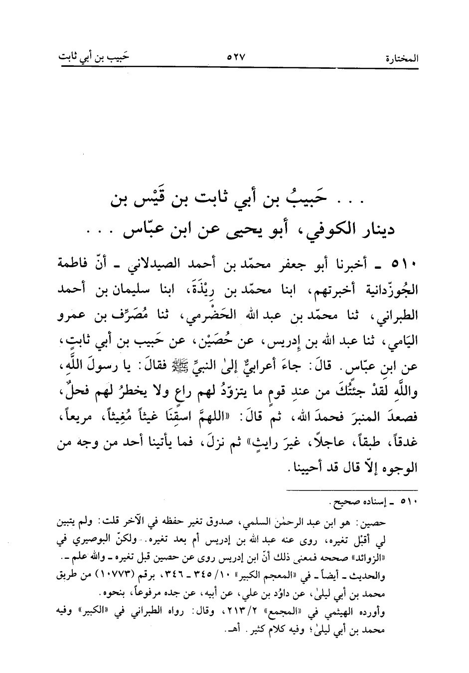 ٥١٠ - أَخْبَرَنَا أَبُو جَعْفَرٍ مُحَمَّدُ بْنُ أَحْمَدَ الصَّيْدَلَانِيُّ: أَنَّ فَاطِمَةَ الْجُوزْدَانِيَّةَ أَخْبَرَتْهُمْ، أَبْنَا مُحَمَّدُ بْنُ رِيذَةَ، أَبْنَا سُلَيْمَانُ بْنُ أَحْمَدَ الطَّبَرَانِيُّ، ثَنَا مُحَمَّدُ بْنُ عَبْدِ اللهِ الْحَضْرَمِيُّ، ثَنَا مُصَرِّفُ بْنُ عَمْرٍو الْيَامِيُّ، ثَنَا عَبْدُ اللهِ بْنُ إِدْرِيسَ، عَنْ حُصَيْنٍ، عَنْ حَبِيبِ بْنِ أَبِي ثَابِتٍ، عَنِ ابْنِ عَبَّاسٍ قَالَ: «جَاءَ أَعْرَابِيٌّ إِلَى النَّبِيِّ صَلَّى اللهُ عَلَيْهِ وَسَلَّمَ فَقَالَ: يَا رَسُولَ اللهِ، وَاللهِ لَقَدْ جِئْتُكَ مِنْ عِنْدِ قَوْمٍ مَا يَتَزَوَّدُ لَهُمْ رَاعٍ وَلَا يَخْطِرُ لَهُمْ فَحْلٌ، فَصَعِدَ الْمِنْبَرَ فَحَمِدَ اللهَ، ثُمَّ قَالَ: اللَّهُمَّ اسْقِنَا غَيْثًا مُغِيثًا مَرِيعًا غَدَقًا طَبَقًا عَاجِلًا غَيْرَ رَايِثٍ، ثُمَّ نَزَلَ، فَمَا يَأْتِينَا أَحَدٌ مِنْ وَجْهٍ مِنَ الْوُجُوهِ إِلَّا قَالَ: قَدْ أُحْيِينَا».