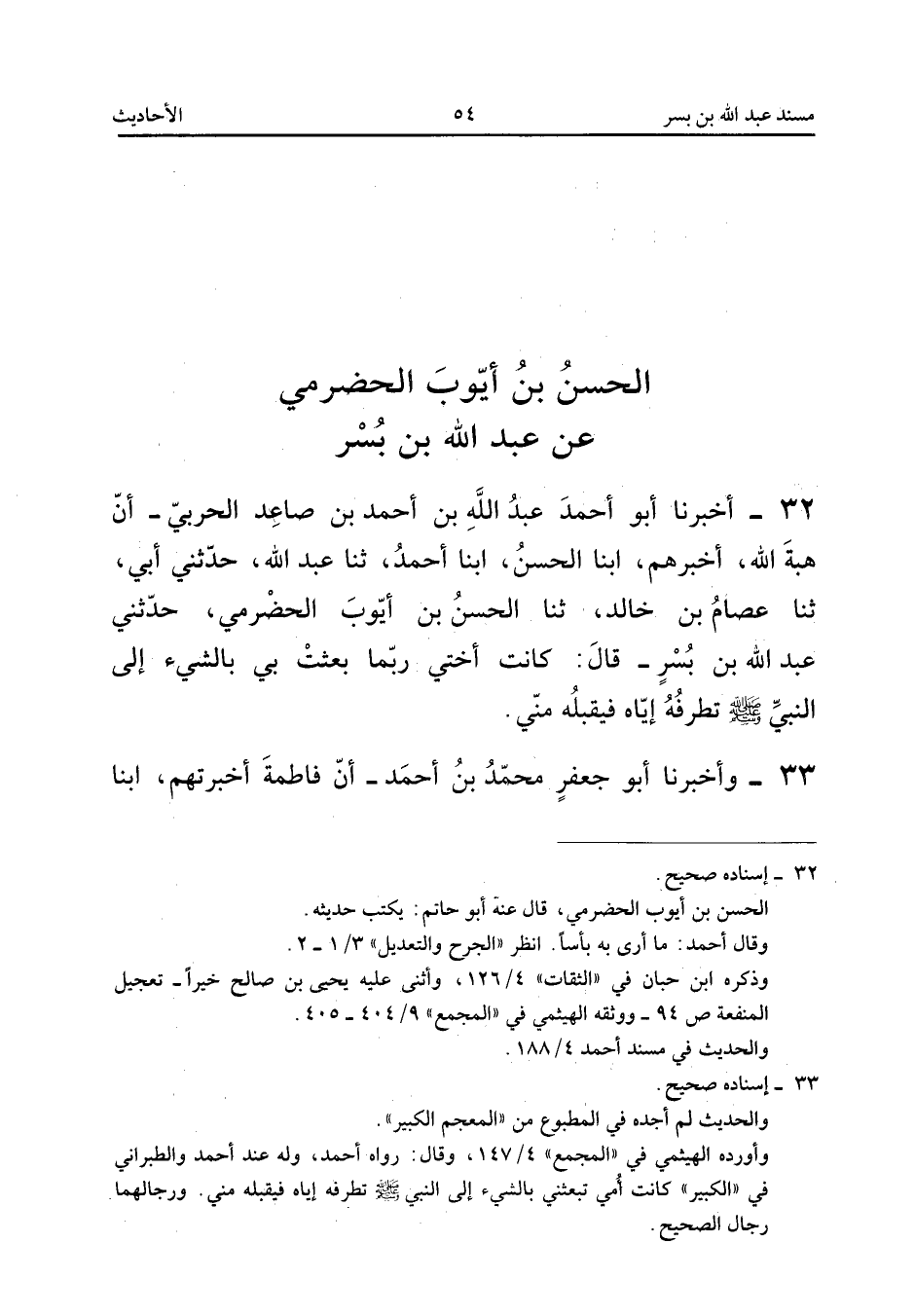 ٣٢ - أَخْبَرَنَا أَبُو أَحْمَدَ عَبْدُ اللهِ بْنُ أَحْمَدَ بْنِ صَاعِدٍ الْحَرْبِيُّ، أَنَّ هِبَةَ اللهِ أَخْبَرَهُمْ، أَبْنَا الْحَسَنُ، أَبْنَا أَحْمَدُ، ثَنَا عَبْدُ اللهِ، حَدَّثَنِي أَبِي، ثَنَا عِصَامُ بْنُ خَالِدٍ، ثَنَا الْحَسَنُ بْنُ أَيُّوبَ الْحَضْرَمِيُّ، حَدَّثَنِي عَبْدُ اللهِ بْنُ بُسْرٍ قَالَ: «كَانَتْ أُخْتِي رُبَّمَا بَعَثَتْ بِي بِالشَّيْءِ إِلَى النَّبِيِّ صَلَّى اللهُ عَلَيْهِ وَسَلَّمَ تُطْرِفُهُ إِيَّاهُ، فَيَقْبَلُهُ مِنِّي».