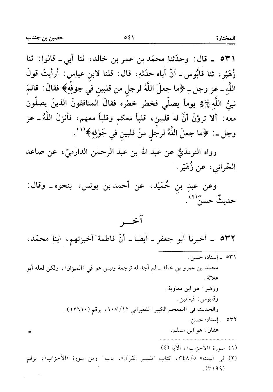 ٥٣١ - قَالَ: وَحَدَّثَنَا مُحَمَّدُ بْنُ عُمَرَ بْنِ خَالِدٍ (¬١)، ثَنَا أَبِي، قَالُوا: ثَنَا زُهَيْرٌ، ثَنَا قَابُوسُ أَنَّ أَبَاهُ حَدَّثَهُ قَالَ: قُلْنَا لِابْنِ عَبَّاسٍ: «أَرَأَيْتَ قَوْلَ اللهِ عَزَّ وَجَلَّ: {مَا جَعَلَ اللهُ لِرَجُلٍ مِنْ قَلْبَيْنِ فِي جَوْفِهِ} فَقَالَ: قَامَ نَبِيُّ اللهِ صَلَّى اللهُ عَلَيْهِ وَسَلَّمَ يَوْمًا يُصَلِّي فَخَطَرَ خَطْرَةً، فَقَالَ الْمُنَافِقُونَ الَّذِينَ يُصَلُّونَ مَعَهُ: أَلَا تَرَوْنَ أَنَّ لَهُ قَلْبَيْنِ، قَلْبًا مَعَكُمْ وَقَلْبًا مَعَهُمْ، فَأَنْزَلَ اللهُ عَزَّ وَجَلَّ: {مَا جَعَلَ اللهُ لِرَجُلٍ مِنْ قَلْبَيْنِ فِي جَوْفِهِ}».