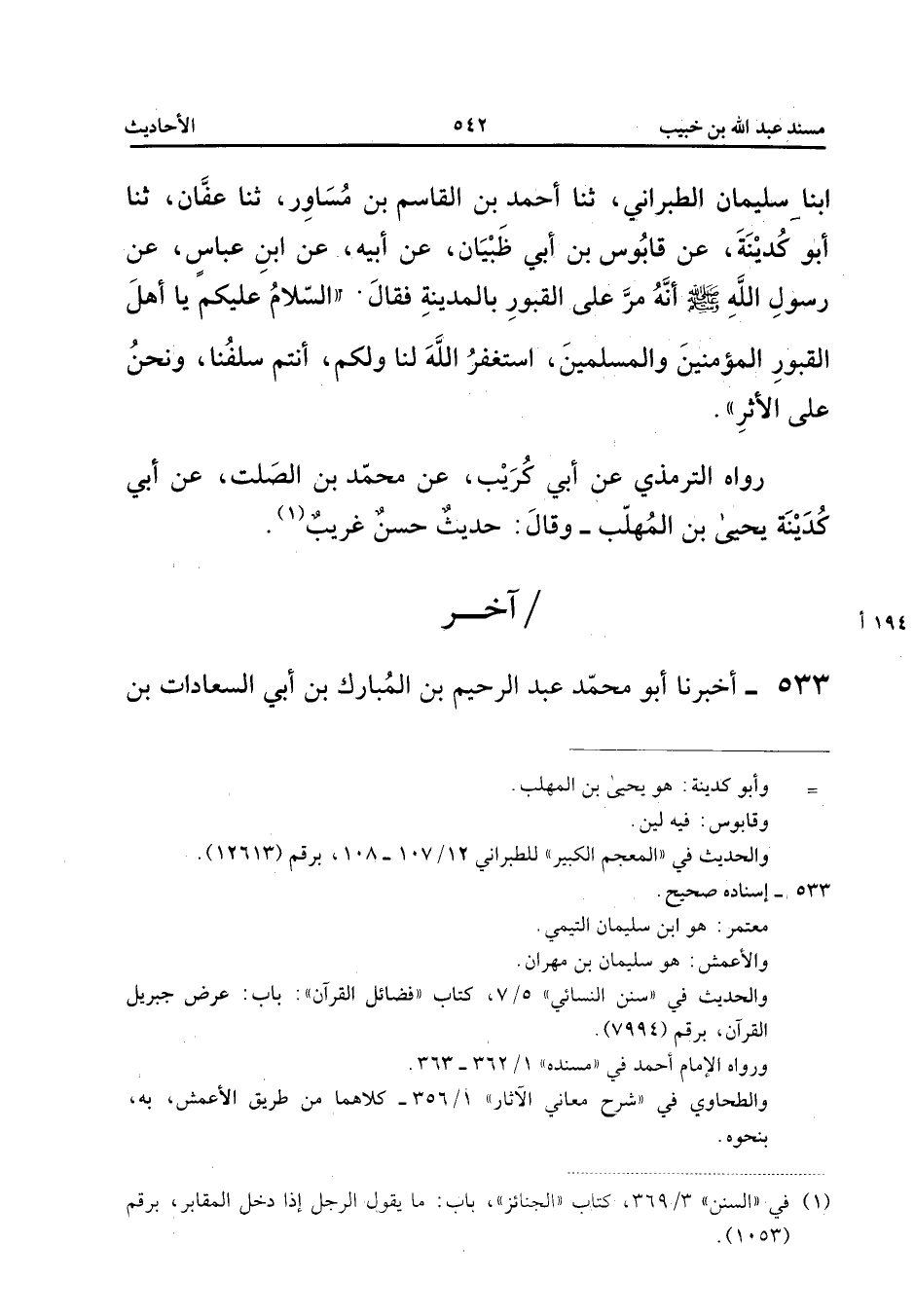 طِرَادٍ - بِبَغْدَادَ - أَنَّ الْحَافِظَ أَبَا الْفَضْلِ مُحَمَّدَ بْنَ نَاصِرِ بْنِ عَلِيٍّ أَخْبَرَهُمْ، أَبْنَا أَبُو طَاهِرٍ مُحَمَّدُ بْنُ أَحْمَدَ بْنِ أَبِي الصَّقْرِ الْأَنْبَارِيُّ، أَبْنَا أَبُو عَلِيٍّ الْحَسَنُ بْنُ مَيْمُونِ بْنِ مُحَمَّدِ بْنِ عَبْدِ الْغَفَّارِ الصَّدَفِيُّ، أَبْنَا مُحَمَّدُ بْنُ عَبْدِ اللهِ بْنِ زَكَرِيَّا بْنِ حَيُّوَيْهِ، ثَنَا أَحْمَدُ بْنُ شُعَيْبٍ النَّسَائِيُّ، أَبْنَا نَصْرُ بْنُ عَلِيٍّ، عَنْ مُعْتَمِرٍ، عَنْ أَبِيهِ، عَنِ الْأَعْمَشِ، عَنْ أَبِي ظِبْيَانَ قَالَ: قَالَ لَنَا ابْنُ عَبَّاسٍ: «أَيُّ الْقِرَاءَتَيْنِ تَقْرَءُونَ؟ قُلْنَا: قِرَاءَةُ عَبْدِ اللهِ، قَالَ: إِنَّ رَسُولَ اللهِ صَلَّى اللهُ عَلَيْهِ وَسَلَّمَ كَانَ يُعْرَضُ عَلَيْهِ الْقُرْآنُ فِي كُلِّ عَامٍ مَرَّةً، وَإِنَّهُ عُرِضَ عَلَيْهِ الْعَامَ الَّذِي قُبِضَ فِيهِ مَرَّتَيْنِ، فَشَهِدَ عَبْدُ اللهِ مَا نُسِخَ».
