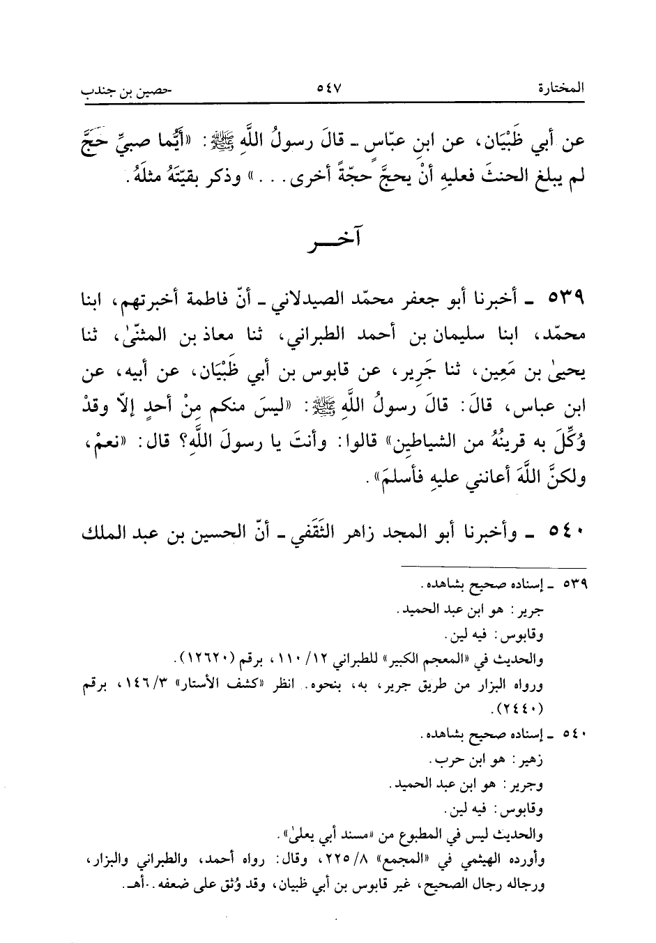 ٥٣٩ - أَخْبَرَنَا أَبُو جَعْفَرٍ مُحَمَّدٌ الصَّيْدَلَانِيُّ، أَنَّ فَاطِمَةَ أَخْبَرَتْهُمْ، أَبْنَا مُحَمَّدٌ، أَبْنَا سُلَيْمَانُ بْنُ أَحْمَدَ الطَّبَرَانِيُّ، ثَنَا مُعَاذُ بْنُ الْمُثَنَّى، ثَنَا يَحْيَى بْنُ مَعِينٍ، ثَنَا جَرِيرٌ، عَنْ قَابُوسَ بْنِ أَبِي ظِبْيَانَ، عَنْ أَبِيهِ، عَنِ ابْنِ عَبَّاسٍ قَالَ: قَالَ رَسُولُ اللهِ صَلَّى اللهُ عَلَيْهِ وَسَلَّمَ: «لَيْسَ مِنْكُمْ مِنْ أَحَدٍ إِلَّا وَقَدْ وُكِّلَ بِهِ قَرِينُهُ مِنَ الشَّيَاطِينِ، قَالُوا: وَأَنْتَ يَا رَسُولَ اللهِ؟ قَالَ: نَعَمْ، وَلَكِنَّ اللهَ أَعَانَنِي عَلَيْهِ فَأَسْلَمَ».