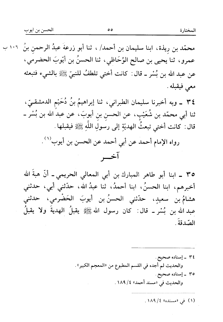 ٣٥ - أَبْنَا أَبُو طَاهِرٍ الْمُبَارَكُ بْنُ أَبِي الْمَعَالِي الْحَرِيمِيُّ، أَنَّ هِبَةَ اللهِ أَخْبَرَهُمْ، أَبْنَا الْحَسَنُ، أَبْنَا أَحْمَدُ، ثَنَا عَبْدُ اللهِ، حَدَّثَنِي أَبِي، حَدَّثَنِي هِشَامُ بْنُ سَعِيدٍ، حَدَّثَنِي الْحَسَنُ بْنُ أَيُّوبَ الْحَضْرَمِيُّ، حَدَّثَنِي عَبْدُ اللهِ بْنُ بُسْرٍ، قَالَ: «كَانَ رَسُولُ اللهِ صَلَّى اللهُ عَلَيْهِ وَسَلَّمَ يَقْبَلُ الْهَدِيَّةَ وَلَا يَقْبَلُ الصَّدَقَةَ».