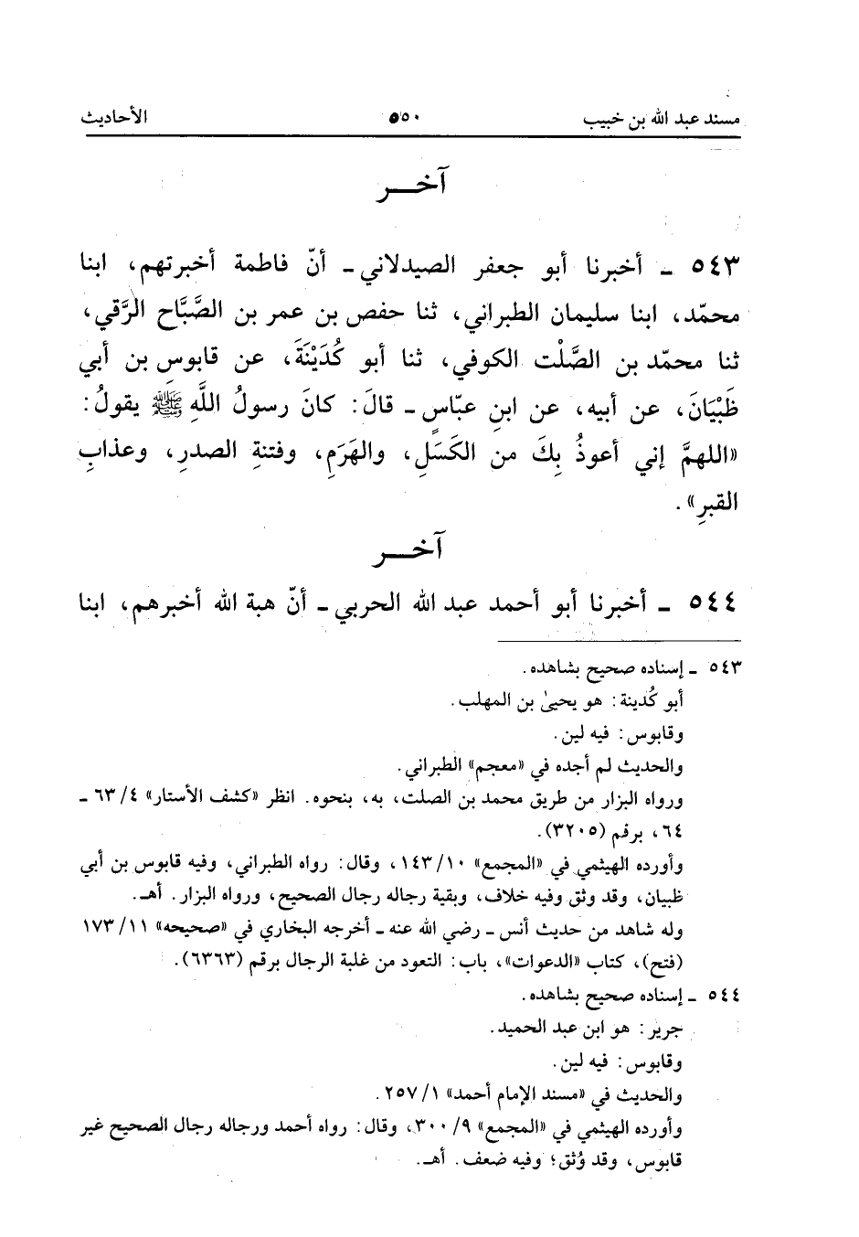 ٥٤٣ - أَخْبَرَنَا أَبُو جَعْفَرٍ الصَّيْدَلَانِيُّ، أَنَّ فَاطِمَةَ أَخْبَرَتْهُمْ، أَبْنَا مُحَمَّدٌ، أَبْنَا سُلَيْمَانُ الطَّبَرَانِيُّ، ثَنَا حَفْصُ بْنُ عُمَرَ بْنِ الصَّبَّاحِ الرَّقِّيُّ، ثَنَا مُحَمَّدُ بْنُ الصَّلْتِ الْكُوفِيُّ، ثَنَا أَبُو كُدَيْنَةَ، عَنْ قَابُوسَ بْنِ أَبِي ظِبْيَانَ، عَنْ أَبِيهِ، عَنِ ابْنِ عَبَّاسٍ قَالَ: «كَانَ رَسُولُ اللهِ صَلَّى اللهُ عَلَيْهِ وَسَلَّمَ يَقُولُ: اللَّهُمَّ إِنِّي أَعُوذُ بِكَ مِنَ الْكَسَلِ وَالْهَرَمِ وَفِتْنَةِ الصَّدْرِ وَعَذَابِ الْقَبْرِ».