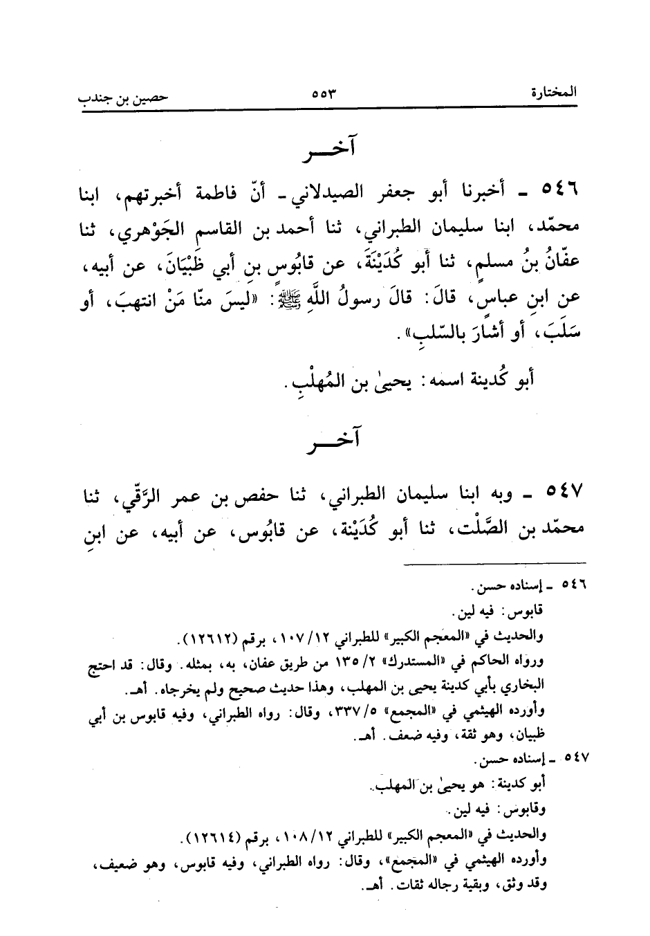 ٥٤٦ - أَخْبَرَنَا أَبُو جَعْفَرٍ الصَّيْدَلَانِيُّ، أَنَّ فَاطِمَةَ أَخْبَرَتْهُمْ، أَبْنَا مُحَمَّدٌ، أَبْنَا سُلَيْمَانُ الطَّبَرَانِيُّ، ثَنَا أَحْمَدُ بْنُ الْقَاسِمِ الْجَوْهَرِيُّ، ثَنَا عَفَّانُ بْنُ مُسْلِمٍ، ثَنَا أَبُو كُدَيْنَةَ، عَنْ قَابُوسَ بْنِ أَبِي ظِبْيَانَ، عَنْ أَبِيهِ، عَنِ ابْنِ عَبَّاسٍ قَالَ: قَالَ رَسُولُ اللهِ صَلَّى اللهُ عَلَيْهِ وَسَلَّمَ: «لَيْسَ مِنَّا مَنِ انْتَهَبَ أَوْ سَلَبَ أَوْ أَشَارَ بِالسَّلَبِ».