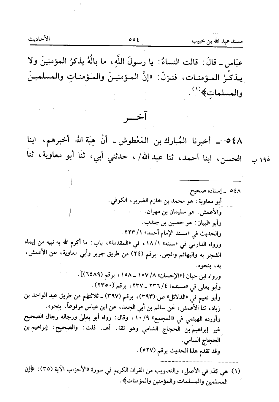 ٥٤٨ - أَخْبَرَنَا الْمُبَارَكُ بْنُ الْمَعْطُوشِ، أَنَّ هِبَةَ اللهِ أَخْبَرَهُمْ، أَبْنَا الْحَسَنُ، أَبْنَا أَحْمَدُ، ثَنَا عَبْدُ اللهِ، حَدَّثَنِي أَبِي، ثَنَا أَبُو مُعَاوِيَةَ، ثَنَا