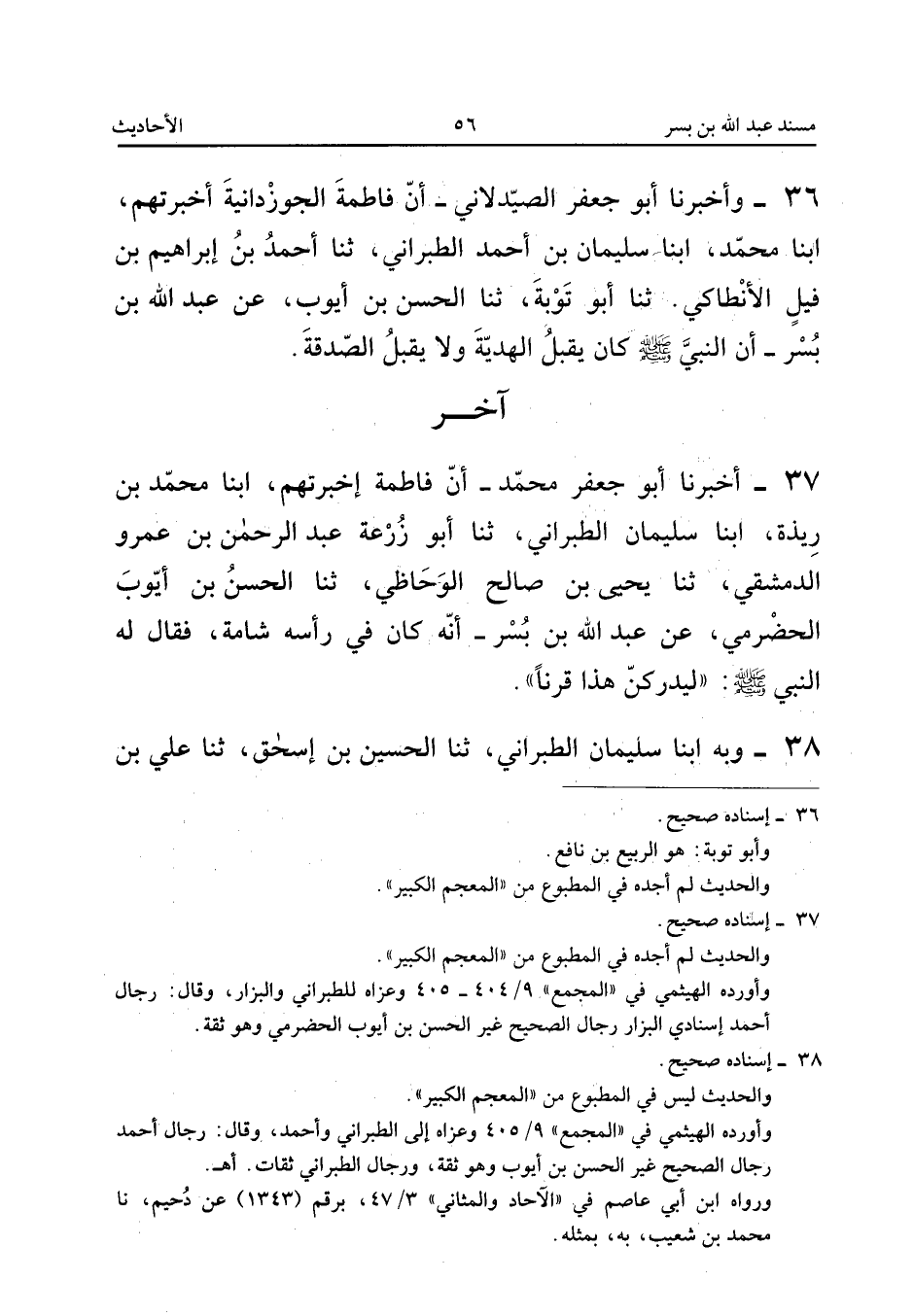 ٣٧ - أَخْبَرَنَا أَبُو جَعْفَرٍ مُحَمَّدٌ، أَنَّ فَاطِمَةَ أَخْبَرَتْهُمْ، أَبْنَا مُحَمَّدُ بْنُ رِيذَةَ، أَبْنَا سُلَيْمَانُ الطَّبَرَانِيُّ، ثَنَا أَبُو زُرْعَةَ عَبْدُ الرَّحْمَنِ بْنُ عَمْرٍو الدِّمَشْقِيُّ، ثَنَا يَحْيَى بْنُ صَالِحٍ الْوُحَاظِيُّ، ثَنَا الْحَسَنُ بْنُ أَيُّوبَ الْحَضْرَمِيُّ، عَنْ عَبْدِ اللهِ بْنِ بُسْرٍ، «أَنَّهُ كَانَ فِي رَأْسِهِ شَامَةٌ، فَقَالَ لَهُ النَّبِيُّ صَلَّى اللهُ عَلَيْهِ وَسَلَّمَ: لَيُدْرِكَنَّ هَذَا قَرْنًا».