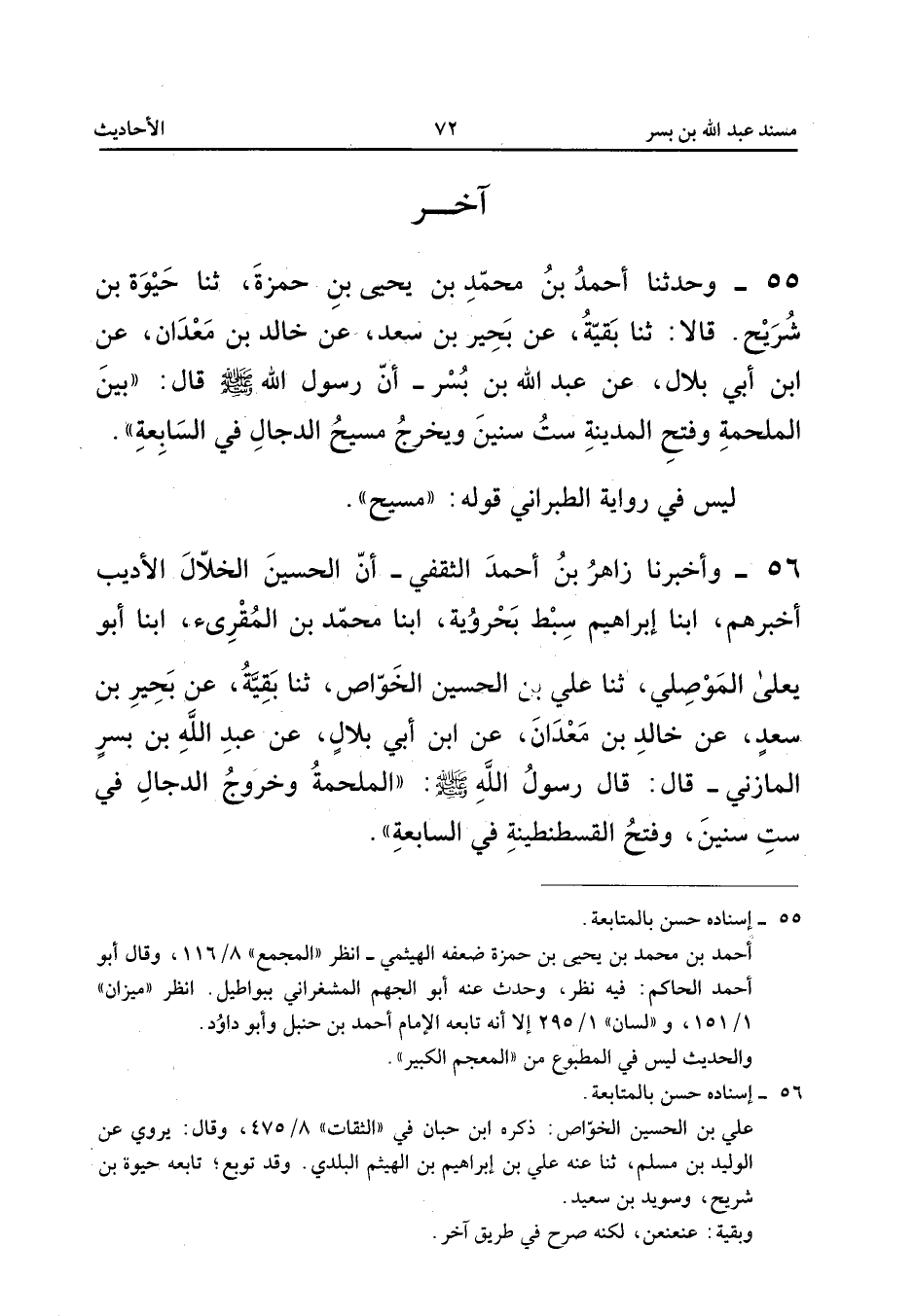 ٥٦ - وَأَخْبَرَنَا زَاهِرُ بْنُ أَحْمَدَ الثَّقَفِيُّ، أَنَّ الْحُسَيْنَ الْخَلَّالَ الْأَدِيبَ أَخْبَرَهُمْ، أَبْنَا إِبْرَاهِيمُ سِبْطُ بَحْرَوَيْهِ، أَبْنَا مُحَمَّدُ بْنُ الْمُقْرِئِ، أَبْنَا أَبُو يَعْلَى الْمَوْصِلِيُّ، ثَنَا عَلِيُّ بْنُ الْحُسَيْنِ الْخَوَاصُّ، ثَنَا بَقِيَّةُ، عَنْ بَحِيرِ بْنِ سَعْدٍ، عَنْ خَالِدِ بْنِ مَعْدَانَ، عَنِ ابْنِ أَبِي بِلَالٍ، عَنْ عَبْدِ اللهِ بْنِ بُسْرٍ الْمَازِنِيِّ قَالَ: قَالَ رَسُولُ اللهِ صَلَّى اللهُ عَلَيْهِ وَسَلَّمَ: «الْمَلْحَمَةُ وَخُرُوجُ الدَّجَّالِ فِي سِتِّ سِنِينَ، وَفَتْحُ الْقُسْطَنْطِينَةِ فِي السَّابِعَةِ».