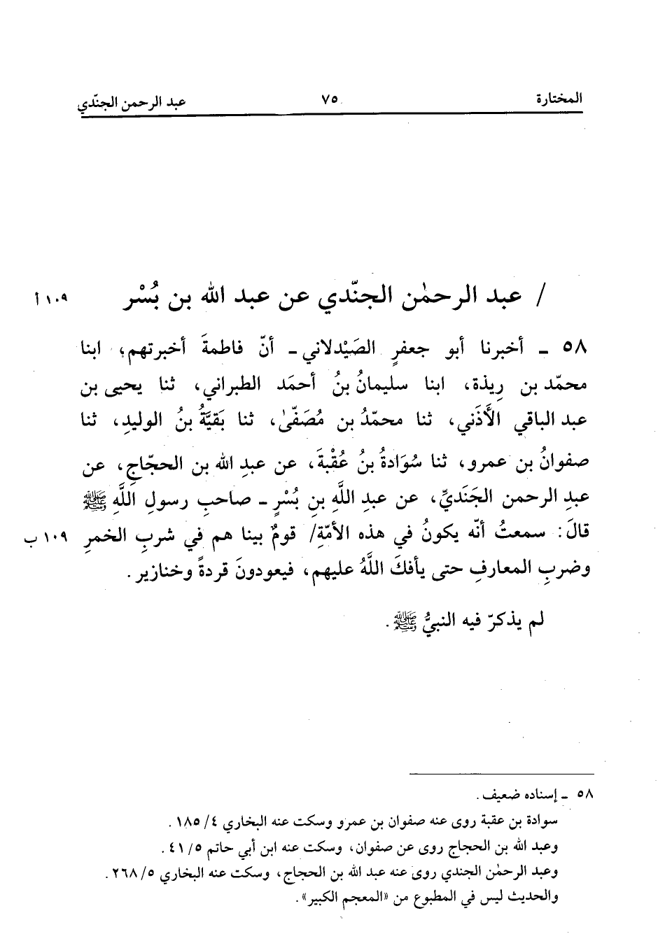 ٥٨ - أَخْبَرَنَا أَبُو جَعْفَرٍ الصَّيْدَلَانِيُّ، أَنَّ فَاطِمَةَ أَخْبَرَتْهُمْ، أَبْنَا مُحَمَّدُ بْنُ رِيذَةَ، أَبْنَا سُلَيْمَانُ بْنُ أَحْمَدَ الطَّبَرَانِيُّ، ثَنَا يَحْيَى بْنُ عَبْدِ الْبَاقِي الْأَذَنِيُّ، ثَنَا مُحَمَّدُ بْنُ مُصَفَّى، ثَنَا بَقِيَّةُ بْنُ الْوَلِيدِ، ثَنَا صَفْوَانُ بْنُ عَمْرٍو، ثَنَا سَوَادَةُ بْنُ عُقْبَةَ، عَنْ عَبْدِ اللهِ بْنِ الْحَجَّاجِ، عَنْ عَبْدِ الرَّحْمَنِ الْجَنَدِيِّ، عَنْ عَبْدِ اللهِ بْنِ بُسْرٍ صَاحِبِ رَسُولِ اللهِ صَلَّى اللهُ عَلَيْهِ وَسَلَّمَ قَالَ: «سَمِعْتُ أَنَّهُ يَكُونُ فِي هَذِهِ الْأُمَّةِ قَوْمٌ بَيْنَا هُمْ فِي شُرْبِ الْخَمْرِ وَضَرْبِ الْمَعَازِفِ حَتَّى يَأْفَكَ اللهُ عَلَيْهِمْ، فَيَعُودُونَ قِرَدَةً وَخَنَازِيرَ».