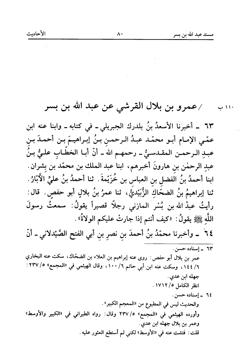 فَاطِمَةَ بِنْتَ عَبْدِ اللهِ أَخْبَرَتْهُمْ، أَبْنَا مُحَمَّدُ بْنُ رِيذَةَ، أَبْنَا سُلَيْمَانُ بْنُ أَحْمَدَ الطَّبَرَانِيُّ، ثَنَا عَمْرُو بْنُ إِسْحَاقَ بْنِ إِبْرَاهِيمَ بْنِ الْعَلَاءِ بْنِ زِبْرِيقٍ الْحِمْصِيُّ، ثَنَا جَدِّي إِبْرَاهِيمُ بْنُ الْعَلَاءِ، ثَنَا عُمَرُ بْنُ بِلَالٍ الْقُرَشِيُّ قَالَ: «رَأَيْتُ عَبْدَ اللهِ بْنَ بُسْرٍ صَاحِبَ رَسُولِ اللهِ صَلَّى اللهُ عَلَيْهِ وَسَلَّمَ وَهُوَ قَاعِدٌ فِي الْمَسْجِدِ، وَكَانَ شَيْخًا كَبِيرًا مُسِنًّا، فَجَاءَهُ غُلَامُهُ، فَقَالَ: يَا مَوْلَايَ هَذِهِ جِمَالُكَ قَدْ أُخِذَتْ فِي سُخْرَةِ الزِّبْلَةِ - يَعْنِي دَارَ الْعَبَّاسِ بْنِ الْوَلِيدِ الَّتِي عِنْدَ بَابِ الْمَسْجِدِ بِحِمْصَ - وَكَانَ مَعَهُ رَجُلَانِ، فَأَخَذَا بِضَبْعَيْهِ حَتَّى قَامَ، قَالَ عُمَرُ: فَمَشَيْتُ مَعَهُ حَتَّى أَتَى الزِّبْلَةَ، فَإِذَا جِمَالُهُ مُنَاخَةٌ، وَإِذَا هُمْ يُسِفُّونَ التُّرَابَ بِالْغَرَائِرِ، فَأَخَذَ الْغِرَارَةَ وَأَقْبَلَ يَفْتَحُ لَهُمْ، وَقَالَ نَاسٌ مَنِ النَّصَارَى: هَذَا صَاحِبُ نَبِيِّكُمْ تَصْنَعُونَ بِهِ هَذَا؟ لَوْ رَأَيْنَا رَجُلًا مِنْ أَصْحَابِ عِيسَى لَحَمَلْنَاهُ عَلَى رُؤُوسِنَا، فَأَهْوَى الْقَوْمُ لِيَأْخُذُوا، فَقَالَ: دَعُونِي، فَإِنِّي سَمِعْتُ رَسُولَ اللهِ صَلَّى اللهُ عَلَيْهِ وَسَلَّمَ يَقُولُ: كَيْفَ أَنْتُمْ إِذَا جَارَتْ عَلَيْكُمُ الْوُلَاةُ».