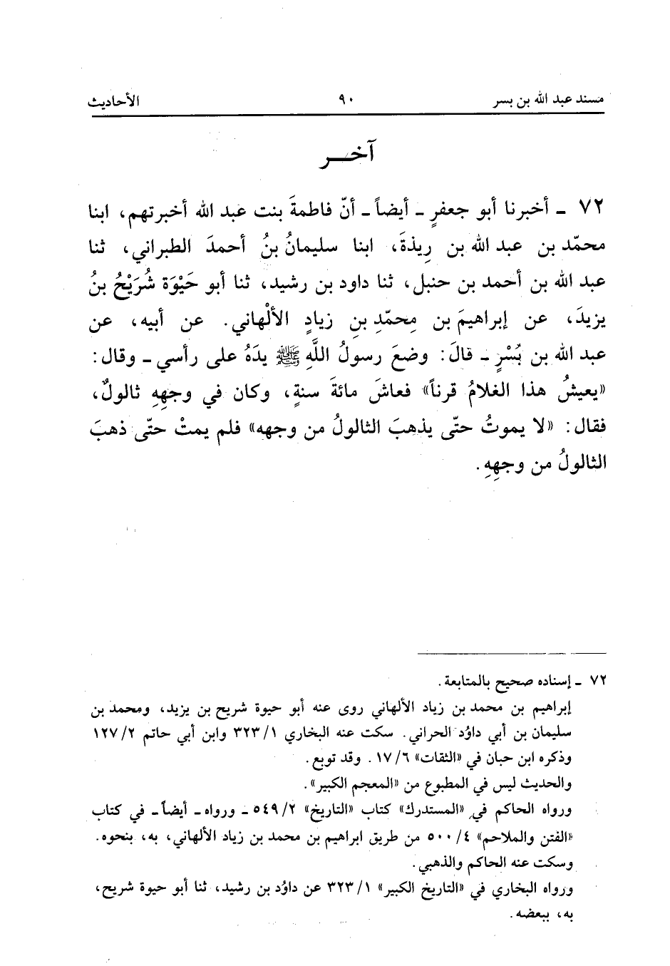 ٧٢ - أَخْبَرَنَا أَبُو جَعْفَرٍ أَيْضًا، أَنَّ فَاطِمَةَ بِنْتَ عَبْدِ اللهِ أَخْبَرَتْهُمْ، أَبْنَا مُحَمَّدُ بْنُ عَبْدِ اللهِ بْنِ رِيذَةَ، أَبْنَا سُلَيْمَانُ بْنُ أَحْمَدَ الطَّبَرَانِيُّ، ثَنَا عَبْدُ اللهِ بْنُ أَحْمَدَ بْنِ حَنْبَلٍ، ثَنَا دَاوُدُ بْنُ رُشَيْدٍ، ثَنَا أَبُو حَيْوَةَ شُرَيْحُ بْنُ يَزِيدَ، عَنْ إِبْرَاهِيمَ بْنِ مُحَمَّدِ بْنِ زِيَادٍ الْأَلْهَانِيِّ، عَنْ أَبِيهِ، عَنْ عَبْدِ اللهِ بْنِ بُسْرٍ، قَالَ: «وَضَعَ رَسُولُ اللهِ صَلَّى اللهُ عَلَيْهِ وَسَلَّمَ يَدَهُ عَلَى رَأْسِي وَقَالَ: يَعِيشُ هَذَا الْغُلَامُ قَرْنًا، فَعَاشَ مِائَةَ سَنَةٍ، وَكَانَ فِي وَجْهِهِ ثَالُولٌ، فَقَالَ: لَا يَمُوتُ حَتَّى يَذْهَبَ الثَّالُولُ مِنْ وَجْهِهِ، فَلَمْ يَمُتْ حَتَّى ذَهَبَ الثَّالُولُ مِنْ وَجْهِهِ».