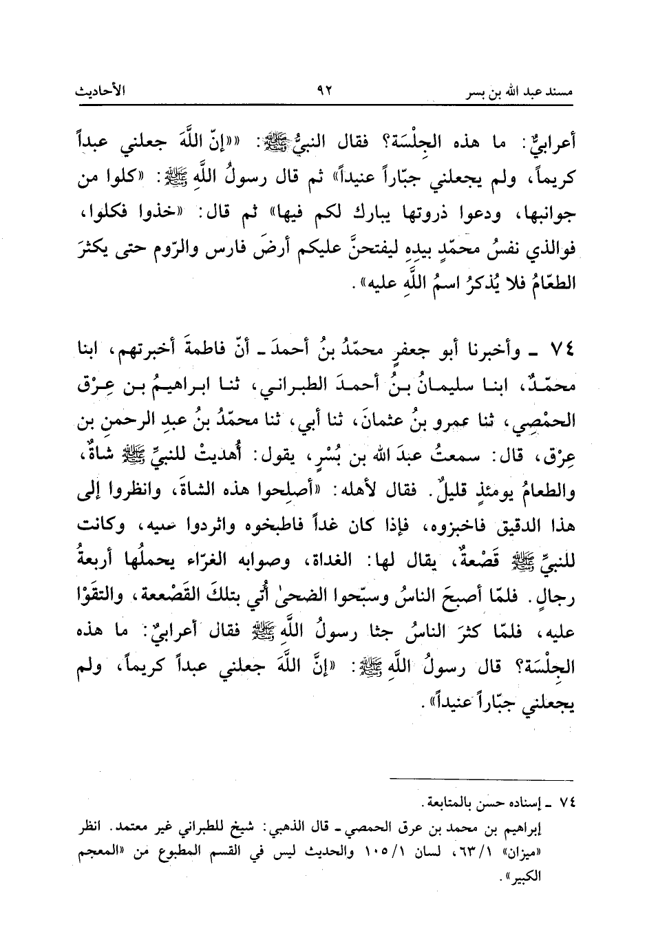 ٧٤ - وَأَخْبَرَنَا أَبُو جَعْفَرٍ مُحَمَّدُ بْنُ أَحْمَدَ، أَنَّ فَاطِمَةَ أَخْبَرَتْهُمْ، أَبْنَا مُحَمَّدٌ، أَبْنَا سُلَيْمَانُ بْنُ أَحْمَدَ الطَّبَرَانِيُّ، ثَنَا إِبْرَاهِيمُ بْنُ عِرْقٍ الْحِمْصِيُّ، ثَنَا عَمْرُو بْنُ عُثْمَانَ، ثَنَا أَبِي، ثَنَا مُحَمَّدُ بْنُ عَبْدِ الرَّحْمَنِ بْنِ عِرْقٍ، قَالَ: سَمِعْتُ عَبْدَ اللهِ بْنَ بُسْرٍ يَقُولُ: «أُهْدِيَتْ لِلنَّبِيِّ صَلَّى اللهُ عَلَيْهِ وَسَلَّمَ شَاةٌ، وَالطَّعَامُ يَوْمَئِذٍ قَلِيلٌ، فَقَالَ لِأَهْلِهِ: أَصْلِحُوا هَذِهِ الشَّاةَ، وَانْظُرُوا إِلَى هَذَا الدَّقِيقِ فَاخْبِزُوهُ، فَإِذَا كَانَ غَدًا فَاطْبُخُوهُ وَاثْرِدُوا عَلَيْهِ، وَكَانَتْ لِلنَّبِيِّ صَلَّى اللهُ عَلَيْهِ وَسَلَّمَ قَصْعَةٌ يُقَالُ لَهَا: الْغَدَاةُ - وَصَوَابُهُ: الْغَرَّاءُ - يَحْمِلُهَا أَرْبَعَةُ رِجَالٍ، فَلَمَّا أَصْبَحَ النَّاسُ وَسَبَّحُوا الضُّحَى أُتِيَ بِتِلْكَ الْقَصْعَةِ وَالْتَقَوْا عَلَيْهِ، فَلَمَّا كَثُرَ النَّاسُ جَثَا رَسُولُ اللهِ صَلَّى اللهُ عَلَيْهِ وَسَلَّمَ، فَقَالَ أَعْرَابِيٌّ: مَا هَذِهِ الْجِلْسَةُ؟ قَالَ رَسُولُ اللهِ صَلَّى اللهُ عَلَيْهِ وَسَلَّمَ: إِنَّ اللهَ جَعَلَنِي عَبْدًا كَرِيمًا، وَلَمْ يَجْعَلْنِي جَبَّارًا عَنِيدًا».