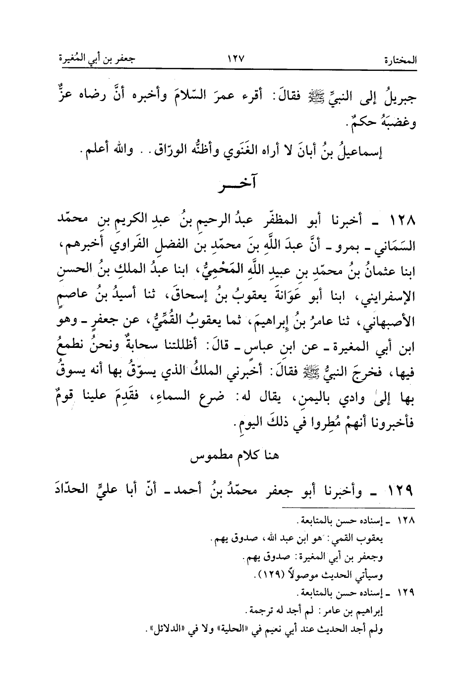 ١٢٨ - أَخْبَرَنَا أَبُو الْمُظَفَّرِ عَبْدُ الرَّحِيمِ بْنُ عَبْدِ الْكَرِيمِ بْنِ مُحَمَّدٍ السَّمَانِيُّ - بِمَرْوَ - أَنَّ عَبْدَ اللهِ بْنَ مُحَمَّدِ بْنِ الْفَضْلِ الْفُرَاوِيَّ أَخْبَرَهُمْ، أَبْنَا عُثْمَانُ بْنُ مُحَمَّدِ بْنِ عُبَيْدِ اللهِ الْمَحْمِيُّ، أَبْنَا عَبْدُ الْمَلِكِ بْنُ الْحَسَنِ الْإِسْفَرَايِنِيُّ، أَبْنَا أَبُو عَوَانَةَ يَعْقُوبُ بْنُ إِسْحَاقَ، ثَنَا أُسَيْدُ بْنُ عَاصِمٍ الْأَصْبَهَانِيُّ، ثَنَا عَامِرُ بْنُ إِبْرَاهِيمَ، ثَنَا يَعْقُوبُ الْقُمِّيُّ، عَنْ جَعْفَرٍ - وَهُوَ ابْنُ أَبِي الْمُغِيرَةِ - عَنِ ابْنِ عَبَّاسٍ قَالَ: «أَظْلَلَتْنَا سَحَابَةٌ وَنَحْنُ نَطْمَعُ فِيهَا، فَخَرَجَ النَّبِيُّ صَلَّى اللهُ عَلَيْهِ وَسَلَّمَ، فَقَالَ: أَخْبَرَنِي الْمَلَكُ الَّذِي يَسُوقُ بِهَا أَنَّهُ يَسُوقُ بِهَا إِلَى وَادٍ بِالْيَمَنِ يُقَالُ لَهُ: ضَرْعُ السَّمَاءِ، فَقَدِمَ عَلَيْنَا قَوْمٌ فَأَخْبَرُونَا أَنَّهُمْ مُطِرُوا فِي ذَلِكَ الْيَوْمِ».