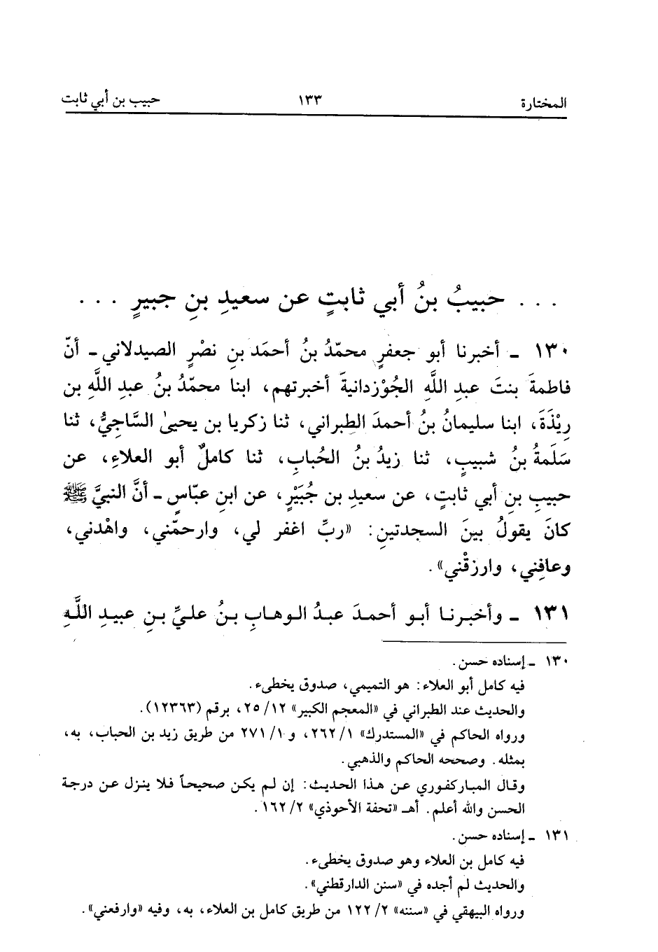 ١٣٠ - أَخْبَرَنَا أَبُو جَعْفَرٍ مُحَمَّدُ بْنُ أَحْمَدَ بْنِ نَصْرٍ الصَّيْدَلَانِيُّ، أَنَّ فَاطِمَةَ بِنْتَ عَبْدِ اللهِ الْجُوزْدَانِيَّةَ أَخْبَرَتْهُمْ، أَبْنَا مُحَمَّدُ بْنُ عَبْدِ اللهِ بْنِ رِيذَةَ، أَبْنَا سُلَيْمَانُ بْنُ أَحْمَدَ الطَّبَرَانِيُّ، ثَنَا زَكَرِيَّا بْنُ يَحْيَى السَّاجِيُّ، ثَنَا سَلَمَةُ بْنُ شَبِيبٍ، ثَنَا زَيْدُ بْنُ الْحُبَابِ، ثَنَا كَامِلٌ أَبُو الْعَلَاءِ، عَنْ حَبِيبِ بْنِ أَبِي ثَابِتٍ، عَنْ سَعِيدِ بْنِ جُبَيْرٍ، عَنِ ابْنِ عَبَّاسٍ أَنَّ النَّبِيَّ صَلَّى اللهُ عَلَيْهِ وَسَلَّمَ «كَانَ يَقُولُ بَيْنَ السَّجْدَتَيْنِ: رَبِّ اغْفِرْ لِي، وَارْحَمْنِي، وَاهْدِنِي، وَعَافِنِي، وَارْزُقْنِي».