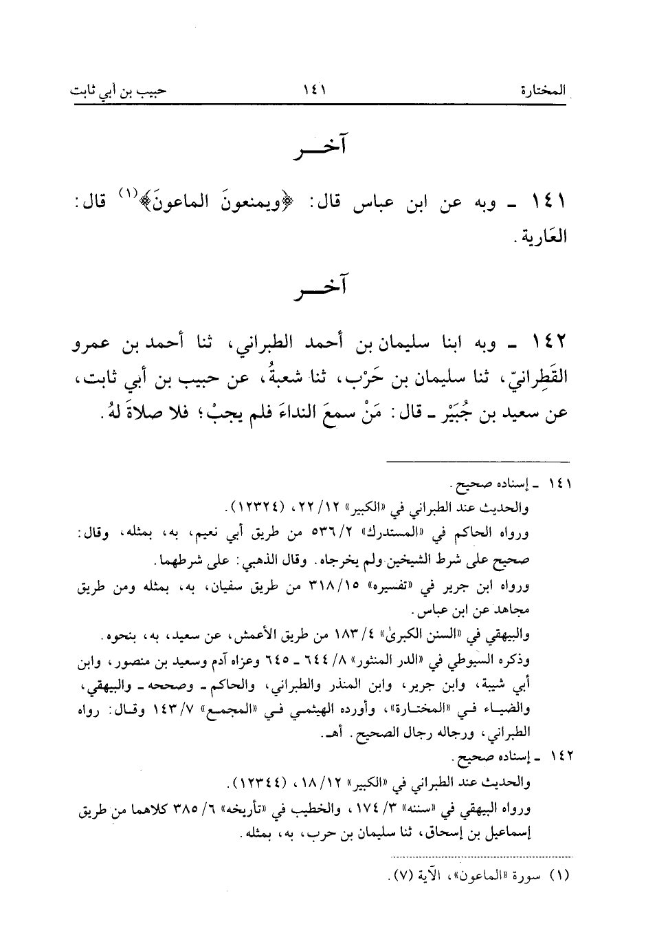 ١٤٢ - وَبِهِ أَبْنَا سُلَيْمَانُ بْنُ أَحْمَدَ الطَّبَرَانِيُّ، ثَنَا أَحْمَدُ بْنُ عَمْرٍو الْقَطِرَانِيُّ، ثَنَا سُلَيْمَانُ بْنُ حَرْبٍ، ثَنَا شُعْبَةُ، عَنْ حَبِيبِ بْنِ أَبِي ثَابِتٍ، عَنْ سَعِيدِ بْنِ جُبَيْرٍ قَالَ: «مَنْ سَمِعَ النِّدَاءَ فَلَمْ يُجِبْ فَلَا صَلَاةَ لَهُ».