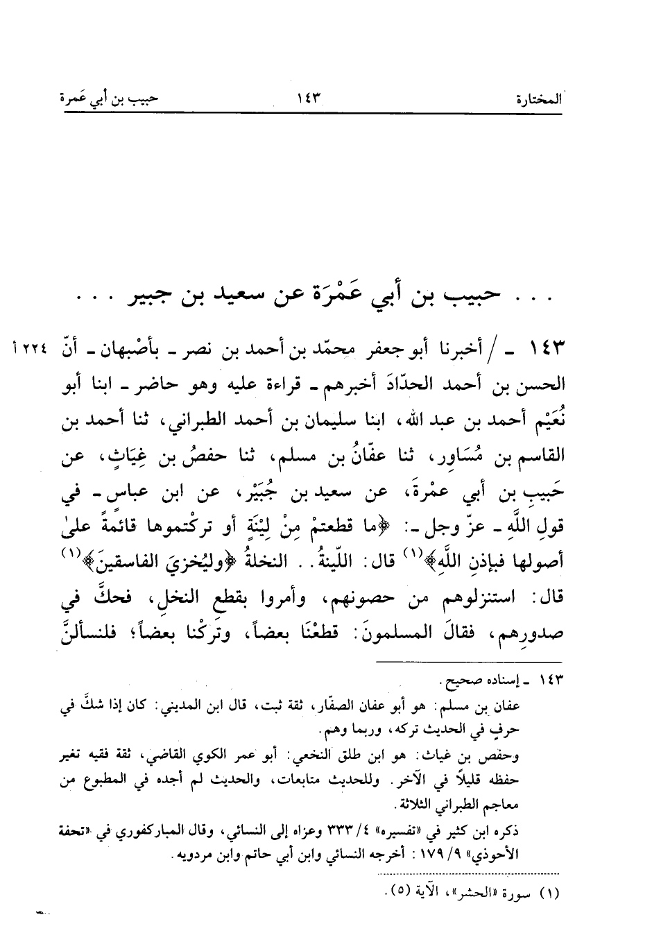 ١٤٣ - أَخْبَرَنَا أَبُو جَعْفَرٍ مُحَمَّدُ بْنُ أَحْمَدَ بْنِ نَصْرٍ - بِأَصْبَهَانَ - أَنَّ الْحَسَنَ بْنَ أَحْمَدَ الْحَدَّادَ أَخْبَرَهُمْ - قِرَاءَةً عَلَيْهِ وَهُوَ حَاضِرٌ - أَبْنَا أَبُو نُعَيْمٍ أَحْمَدُ بْنُ عَبْدِ اللهِ، أَبْنَا سُلَيْمَانُ بْنُ أَحْمَدَ الطَّبَرَانِيُّ، ثَنَا أَحْمَدُ بْنُ الْقَاسِمِ بْنِ مُسَاوِرٍ، ثَنَا عَفَّانُ بْنُ مُسْلِمٍ، ثَنَا حَفْصُ بْنُ غِيَاثٍ، عَنْ حَبِيبِ بْنِ أَبِي عَمْرَةَ، عَنْ سَعِيدِ بْنِ جُبَيْرٍ، عَنِ ابْنِ عَبَّاسٍ فِي قَوْلِ اللهِ عَزَّ وَجَلَّ: «{مَا قَطَعْتُمْ مِنْ لِينَةٍ أَوْ تَرَكْتُمُوهَا قَائِمَةً عَلَى أُصُولِهَا فَبِإِذْنِ اللهِ} قَالَ: اللِّينَةُ؛ النَّخْلَةُ، {وَلِيُخْزِيَ الْفَاسِقِينَ} قَالَ: اسْتَنْزَلُوهُمْ مِنْ حُصُونِهِمْ، وَأُمِرُوا بِقَطْعِ النَّخْلِ فَحَكَّ فِي صُدُورِهِمْ، فَقَالَ الْمُسْلِمُونَ: قَطَعْنَا بَعْضًا وَتَرَكْنَا بَعْضًا؛ فَلَنَسْأَلَنَّ