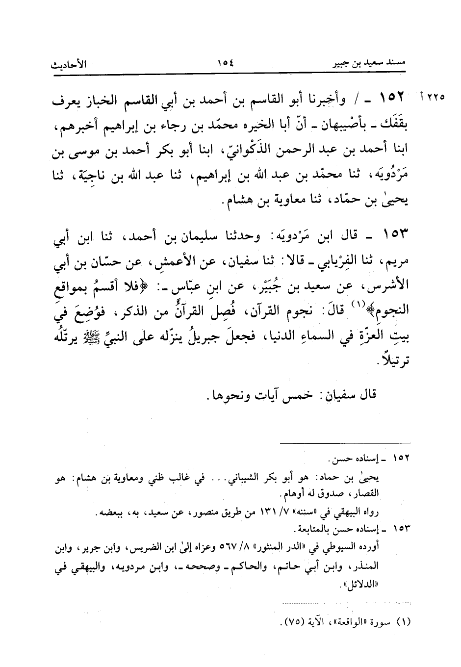 ١٥٣ - قَالَ ابْنُ مَرْدُوَيْهِ: وَحَدَّثَنَا سُلَيْمَانُ بْنُ أَحْمَدَ، ثَنَا ابْنُ أَبِي مَرْيَمَ، ثَنَا الْفِرْيَابِيُّ قَالَا: ثَنَا سُفْيَانُ، عَنِ الْأَعْمَشِ، عَنْ حَسَّانَ بْنِ أَبِي الْأَشْرَسِ، عَنْ سَعِيدِ بْنِ جُبَيْرٍ، عَنِ ابْنِ عَبَّاسٍ: «{فَلا أُقْسِمُ بِمَوَاقِعِ النُّجُومِ} قَالَ: نُجُومُ الْقُرْآنِ، فُصِلَ الْقُرْآنُ مِنَ الذِّكْرِ، فَوُضِعَ فِي بَيْتِ الْعِزَّةِ فِي السَّمَاءِ الدُّنْيَا، فَجَعَلَ جِبْرِيلُ يُنْزِلُهُ عَلَى النَّبِيِّ صَلَّى اللهُ عَلَيْهِ وَسَلَّمَ يُرَتِّلُهُ تَرْتِيلًا».