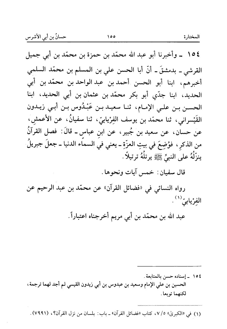 ١٥٤ - وَأَخْبَرَنَا أَبُو عَبْدِ اللهِ مُحَمَّدُ بْنُ حَمْزَةَ بْنِ مُحَمَّدِ بْنِ أَبِي جَمِيلٍ الْقُرَشِيُّ - بِدِمَشْقَ - أَنَّ أَبَا الْحَسَنِ عَلِيَّ بْنَ الْمُسْلِمِ بْنِ مُحَمَّدٍ السُّلَمِيَّ أَخْبَرَهُمْ، أَبْنَا أَبُو الْحَسَنِ أَحْمَدُ بْنُ عَبْدِ الْوَاحِدِ بْنِ مُحَمَّدِ بْنِ أَبِي الْحَدِيدِ، أَبْنَا جَدِّي أَبُو بَكْرٍ مُحَمَّدُ بْنُ عُثْمَانَ بْنِ أَبِي الْحَدِيدِ، أَبْنَا الْحَسَنُ بْنُ عَلِيٍّ الْإِمَامُ، ثَنَا سَعِيدُ بْنُ عَبْدُوسِ بْنِ أَبِي زَيْدُونَ الْقَيْسَرَانِيُّ، ثَنَا مُحَمَّدُ بْنُ يُوسُفَ الْفِرْيَابِيُّ، ثَنَا سُفْيَانُ، عَنِ الْأَعْمَشِ، عَنْ حَسَّانَ، عَنْ سَعِيدِ بْنِ جُبَيْرٍ، عَنِ ابْنِ عَبَّاسٍ قَالَ: «فُصِلَ الْقُرْآنُ مِنَ الذِّكْرِ، فَوُضِعَ فِي بَيْتِ الْعِزَّةِ - يَعْنِي فِي السَّمَاءِ الدُّنْيَا - جَعَلَ جِبْرِيلُ يُنْزِلُهُ عَلَى النَّبِيِّ صَلَّى اللهُ عَلَيْهِ وَسَلَّمَ يُرَتِّلُهُ تَرْتِيلًا».