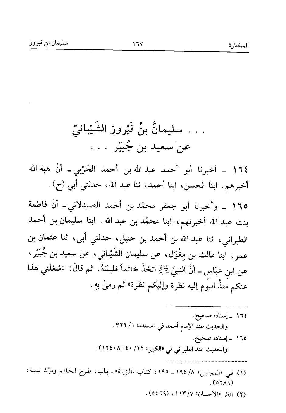 ١٦٥ - وَأَخْبَرَنَا أَبُو جَعْفَرٍ مُحَمَّدُ بْنُ أَحْمَدَ الصَّيْدَلَانِيُّ، أَنَّ فَاطِمَةَ بِنْتَ عَبْدِ اللهِ أَخْبَرَتْهُمْ، أَبْنَا مُحَمَّدُ بْنُ عَبْدِ اللهِ، أَبْنَا سُلَيْمَانُ بْنُ أَحْمَدَ الطَّبَرَانِيُّ، ثَنَا عَبْدُ اللهِ بْنُ أَحْمَدَ بْنِ حَنْبَلٍ، حَدَّثَنِي أَبِي، ثَنَا عُثْمَانُ بْنُ عُمَرَ، أَبْنَا مَالِكُ بْنُ مِغْوَلٍ، عَنْ سُلَيْمَانَ الشَّيْبَانِيِّ، عَنْ سَعِيدِ بْنِ جُبَيْرٍ، عَنِ ابْنِ عَبَّاسٍ «أَنَّ النَّبِيَّ صَلَّى اللهُ عَلَيْهِ وَسَلَّمَ اتَّخَذَ خَاتَمًا فَلَبِسَهُ، ثُمَّ قَالَ: شَغَلَنِي هَذَا عَنْكُمْ مُنْذُ الْيَوْمِ، إِلَيْهِ نَظْرَةٌ وَإِلَيْكُمْ نَظْرَةٌ، ثُمَّ رَمَى بِهِ».