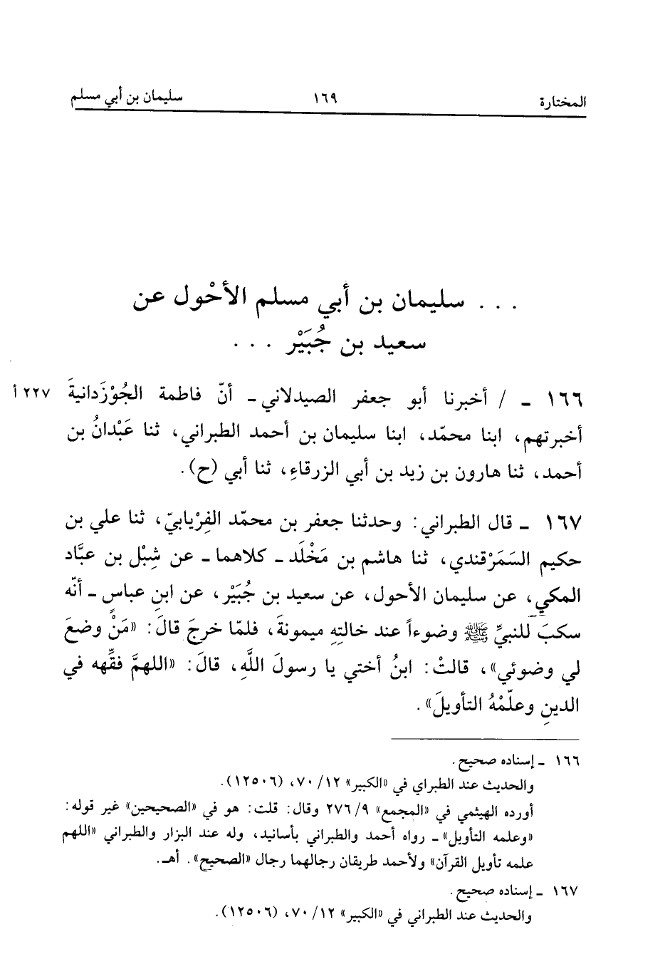 ١٦٧ - قَالَ الطَّبَرَانِيُّ: وَحَدَّثَنَا جَعْفَرُ بْنُ مُحَمَّدٍ الْفِرْيَابِيُّ، ثَنَا عَلِيُّ بْنُ حَكِيمٍ السَّمَرْقَنْدِيُّ، ثَنَا هَاشِمُ بْنُ مَخْلَدٍ كِلَاهُمَا، عَنْ شِبْلِ بْنِ عَبَّادٍ الْمَكِّيِّ، عَنْ سُلَيْمَانَ الْأَحْوَلِ، عَنْ سَعِيدِ بْنِ جُبَيْرٍ، عَنِ ابْنِ عَبَّاسٍ «أَنَّهُ سَكَبَ لِلنَّبِيِّ صَلَّى اللهُ عَلَيْهِ وَسَلَّمَ وَضُوءًا عِنْدَ خَالَتِهِ مَيْمُونَةَ، فَلَمَّا خَرَجَ قَالَ: مَنْ وَضَعَ لِي وَضُوئِي، قَالَتِ: ابْنُ أُخْتِي يَا رَسُولَ اللهِ، قَالَ: اللَّهُمَّ فَقِّهْهُ فِي الدِّينِ وَعَلِّمْهُ التَّأْوِيلَ».