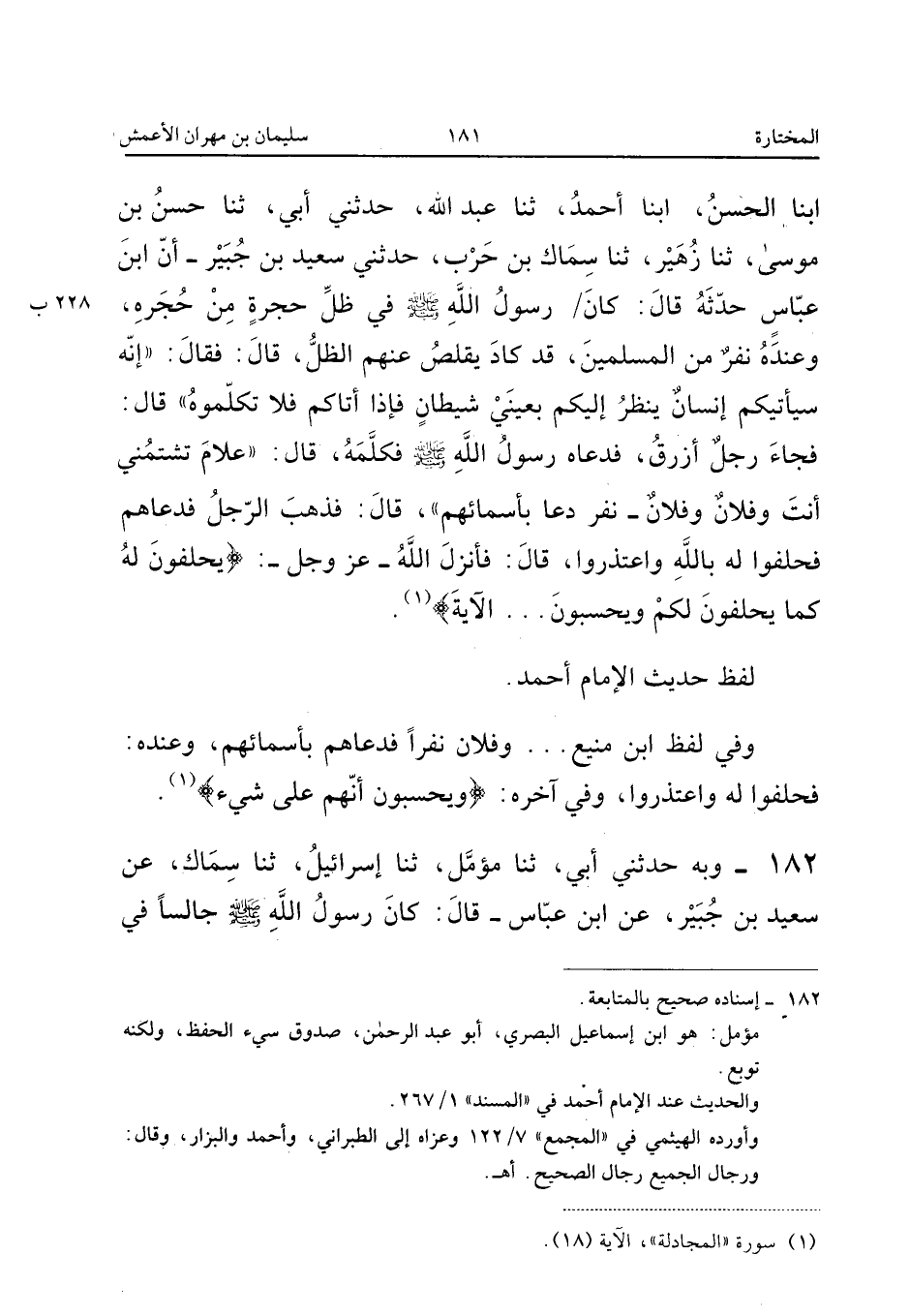 ١٨٢ - وَبِهِ حَدَّثَنِي أَبِي، ثَنَا مُؤَمَّلٌ، ثَنَا إِسْرَائِيلُ، ثَنَا سِمَاكٌ، عَنْ سَعِيدِ بْنِ جُبَيْرٍ، عَنِ ابْنِ عَبَّاسٍ قَالَ: «كَانَ رَسُولُ اللهِ صَلَّى اللهُ عَلَيْهِ وَسَلَّمَ جَالِسًا فِي