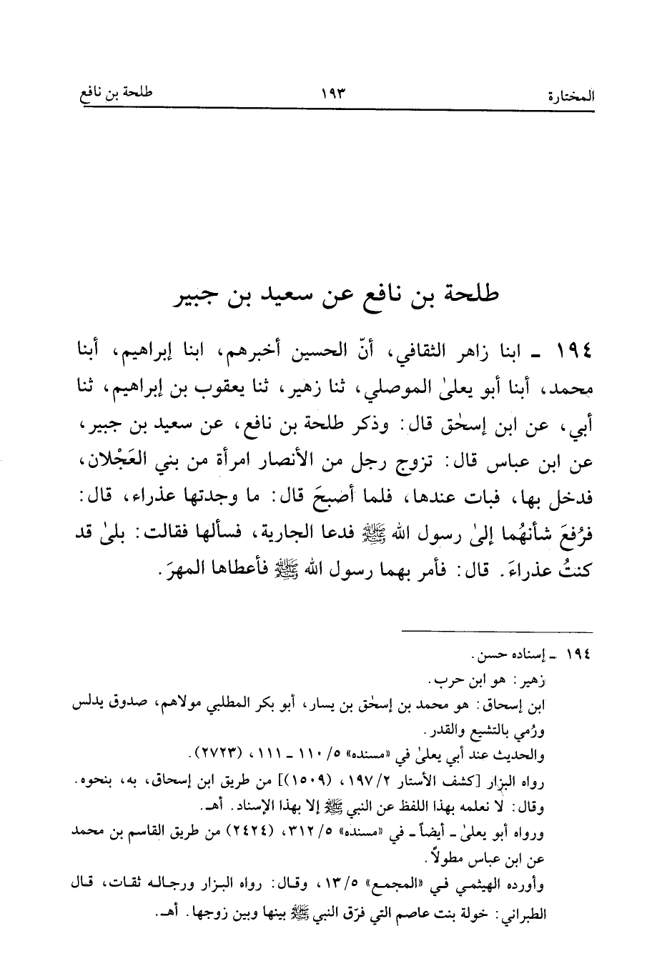 ١٩٤ - أَبْنَا زَاهِرٌ الثَّقَافِيُّ أَنَّ الْحُسَيْنَ أَخْبَرَهُمْ، أَبْنَا إِبْرَاهِيمُ، أَبْنَا مُحَمَّدٌ، أَبْنَا أَبُو يَعْلَى الْمَوْصِلِيُّ، ثَنَا زُهَيْرٌ، ثَنَا يَعْقُوبُ بْنُ إِبْرَاهِيمَ، ثَنَا أَبِي، عَنِ ابْنِ إِسْحَاقَ قَالَ: وَذَكَرَ طَلْحَةَ بْنَ نَافِعٍ، عَنْ سَعِيدِ بْنِ جُبَيْرٍ، عَنِ ابْنِ عَبَّاسٍ قَالَ: «تَزَوَّجَ رَجُلٌ مِنَ الْأَنْصَارِ امْرَأَةً مِنْ بَنِي الْعَجْلَانِ، فَدَخَلَ بِهَا، فَبَاتَ عِنْدَهَا، فَلَمَّا أَصْبَحَ قَالَ: مَا وَجَدْتُهَا عَذْرَاءَ قَالَ: فَرُفِعَ شَأْنُهُمَا إِلَى رَسُولِ اللهِ صَلَّى اللهُ عَلَيْهِ وَسَلَّمَ فَدَعَا الْجَارِيَةَ، فَسَأَلَهَا فَقَالَتْ: بَلَى، قَدْ كُنْتُ عَذْرَاءَ قَالَ: فَأَمَرَ بِهِمَا رَسُولُ اللهِ صَلَّى اللهُ عَلَيْهِ وَسَلَّمَ فَأَعْطَاهَا الْمَهْرَ».