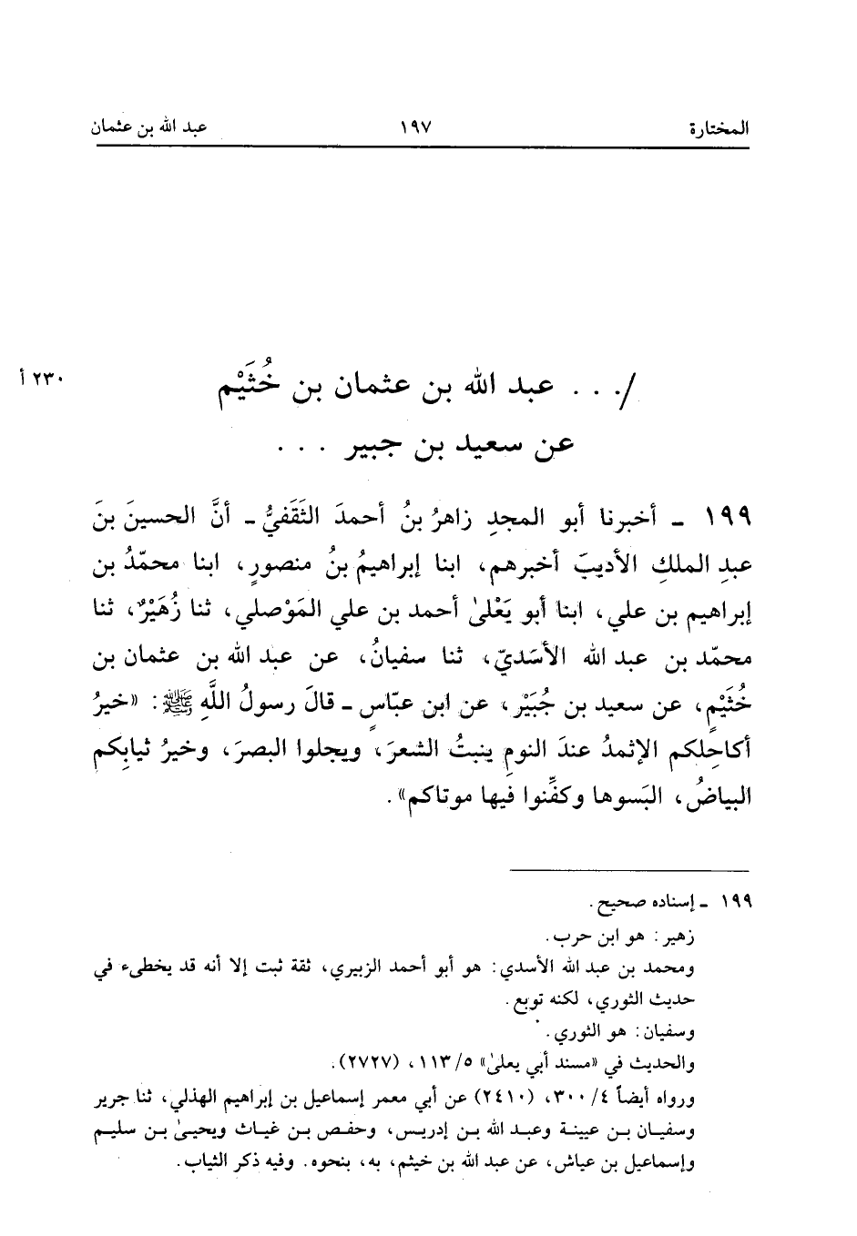 ١٩٩ - أَخْبَرَنَا أَبُو الْمَجْدِ زَاهِرُ بْنُ أَحْمَدَ الثَّقَفِيُّ أَنَّ الْحُسَيْنَ بْنَ عَبْدِ الْمَلِكِ الْأَدِيبَ أَخْبَرَهُمْ، أَبْنَا إِبْرَاهِيمُ بْنُ مَنْصُورٍ، أَبْنَا مُحَمَّدُ بْنُ إِبْرَاهِيمَ بْنِ عَلِيٍّ، أَبْنَا أَبُو يَعْلَى أَحْمَدُ بْنُ عَلِيٍّ الْمَوْصِلِيُّ، ثَنَا زُهَيْرٌ، ثَنَا مُحَمَّدُ بْنُ عَبْدِ اللهِ الْأَسَدِيُّ، ثَنَا سُفْيَانُ، عَنْ عَبْدِ اللهِ بْنِ عُثْمَانَ بْنِ خُثَيْمٍ، عَنْ سَعِيدِ بْنِ جُبَيْرٍ، عَنِ ابْنِ عَبَّاسٍ قَالَ رَسُولُ اللهِ صَلَّى اللهُ عَلَيْهِ وَسَلَّمَ: «خَيْرُ أَكَاحِلِكُمُ الْإِثْمِدُ عِنْدَ النَّوْمِ يُنْبِتُ الشَّعَرَ، وَيَجْلُو الْبَصَرَ، وَخَيْرُ ثِيَابِكُمُ الْبَيَاضُ الْبَسُوهَا وَكَفِّنُوا فِيهَا مَوْتَاكُمْ».