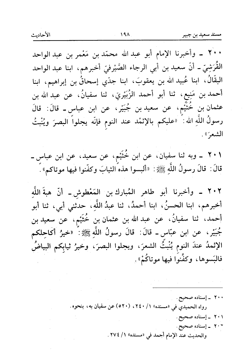 ٢٠٢ - وَأَخْبَرَنَا أَبُو طَاهِرٍ الْمُبَارَكُ بْنُ الْمَعْطُوشِ أَنَّ هِبَةَ اللهِ أَخْبَرَهُمْ، أَبْنَا الْحَسَنُ، أَبْنَا أَحْمَدُ، ثَنَا عَبْدُ اللهِ، حَدَّثَنِي أَبِي، ثَنَا أَبُو أَحْمَدَ، ثَنَا سُفْيَانُ، عَنْ عَبْدِ اللهِ بْنِ عُثْمَانَ بْنِ خُثَيْمٍ، عَنْ سَعِيدِ بْنِ جُبَيْرٍ، عَنِ ابْنِ عَبَّاسٍ، قَالَ: قَالَ رَسُولُ اللهِ صَلَّى اللهُ عَلَيْهِ وَسَلَّمَ: «خَيْرُ أَكَاحِلِكُمُ الْإِثْمِدُ عِنْدَ النَّوْمِ يُنْبِتُ الشَّعَرَ، وَيَجْلُو الْبَصَرَ، وَخَيْرُ ثِيَابِكُمُ الْبَيَاضُ فَالْبَسُوهَا وَكَفِّنُوا فِيهَا مَوْتَاكُمْ».