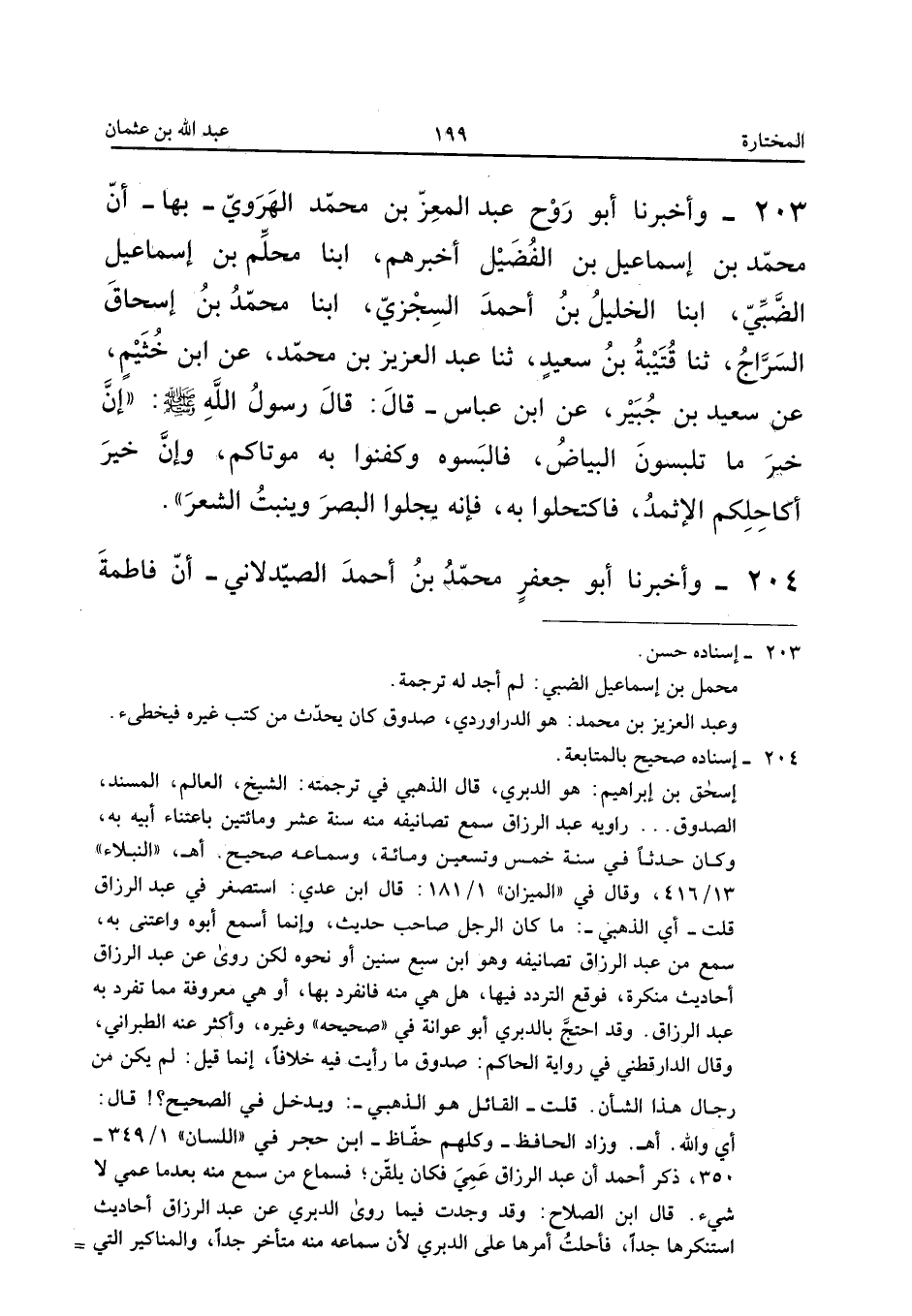 ٢٠٣ - وَأَخْبَرَنَا أَبُو رَوْحٍ عَبْدُ الْمُعِزِّ بْنُ مُحَمَّدٍ الْهَرَوِيُّ - بِهَا - أَنَّ مُحَمَّدَ بْنَ إِسْمَاعِيلَ بْنِ الْفُضَيْلِ أَخْبَرَهُمْ، أَبْنَا مُحَلِّمُ بْنُ إِسْمَاعِيلَ الضَّبِّيُّ، أَبْنَا الْخَلِيلُ بْنُ أَحْمَدَ السِّجْزِيُّ، أَبْنَا مُحَمَّدُ بْنُ إِسْحَاقَ السَّرَّاجُ، ثَنَا قُتَيْبَةُ بْنُ سَعِيدٍ، ثَنَا عَبْدُ الْعَزِيزِ بْنُ مُحَمَّدٍ، عَنِ ابْنِ خُثَيْمٍ، عَنْ سَعِيدِ بْنِ جُبَيْرٍ، عَنِ ابْنِ عَبَّاسٍ، قَالَ: قَالَ رَسُولُ اللهِ صَلَّى اللهُ عَلَيْهِ وَسَلَّمَ: «إِنَّ خَيْرَ مَا تَلْبَسُونَ الْبَيَاضُ فَالْبَسُوهُ وَكَفِّنُوا بِهِ مَوْتَاكُمْ، وَإِنَّ خَيْرَ أَكَاحِلِكُمُ الْإِثْمِدُ فَاكْتَحِلُوا بِهِ، فَإِنَّهُ يَجْلُو الْبَصَرَ وَيُنْبِتُ الشَّعَرَ».