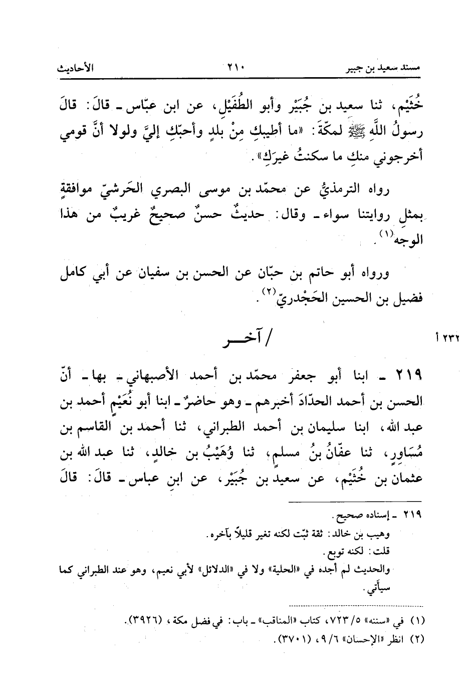 ٢١٩ - أَبْنَا أَبُو جَعْفَرٍ مُحَمَّدُ بْنُ أَحْمَدَ الْأَصْبَهَانِيُّ - بِهَا - أَنَّ الْحَسَنَ بْنَ أَحْمَدَ الْحَدَّادَ أَخْبَرَهُمْ وَهُوَ حَاضِرٌ، أَبْنَا أَبُو نُعَيْمٍ أَحْمَدُ بْنُ عَبْدِ اللهِ، أَبْنَا سُلَيْمَانُ بْنُ أَحْمَدَ الطَّبَرَانِيُّ، ثَنَا أَحْمَدُ بْنُ الْقَاسِمِ بْنِ مُسَاوِرٍ، ثَنَا عَفَّانُ بْنُ مُسْلِمٍ، ثَنَا وُهَيْبُ بْنُ خَالِدٍ، ثَنَا عَبْدُ اللهِ بْنُ عُثْمَانَ بْنِ خُثَيْمٍ، عَنْ سَعِيدِ بْنِ جُبَيْرٍ، عَنِ ابْنِ عَبَّاسٍ، قَالَ: قَالَ
