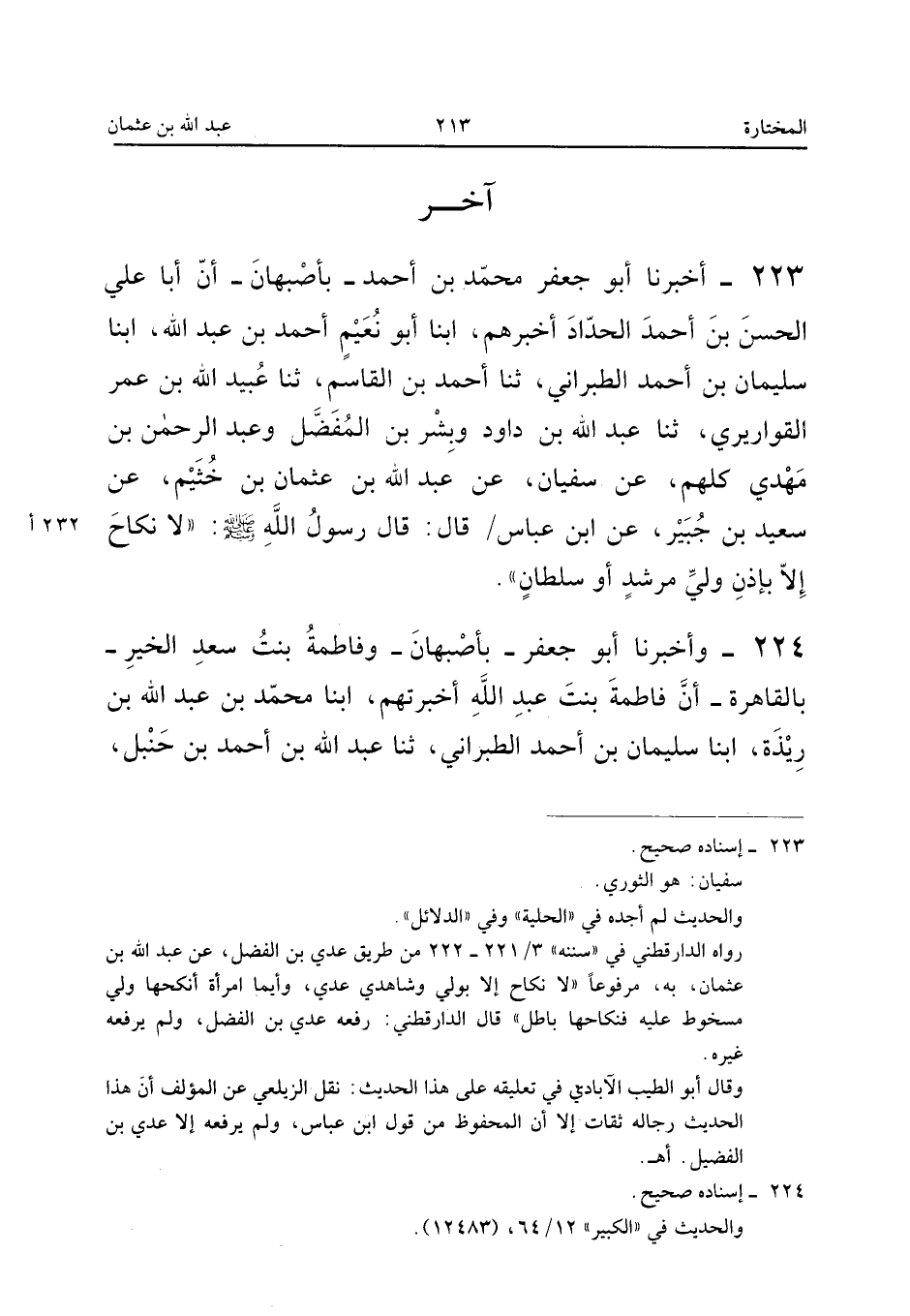 ٢٢٣ - أَخْبَرَنَا أَبُو جَعْفَرٍ مُحَمَّدُ بْنُ أَحْمَدَ - بِأَصْبَهَانَ - أَنَّ أَبَا عَلِيٍّ الْحَسَنَ بْنَ أَحْمَدَ الْحَدَّادَ أَخْبَرَهُمْ، أَبْنَا أَبُو نُعَيْمٍ أَحْمَدُ بْنُ عَبْدِ اللهِ، أَبْنَا سُلَيْمَانُ بْنُ أَحْمَدَ الطَّبَرَانِيُّ، ثَنَا أَحْمَدُ بْنُ الْقَاسِمِ، ثَنَا عُبَيْدُ اللهِ بْنُ عُمَرَ الْقَوَارِيرِيُّ، ثَنَا عَبْدُ اللهِ بْنُ دَاوُدَ، وَبِشْرُ بْنُ الْمُفَضَّلِ، وَعَبْدُ الرَّحْمَنِ بْنُ مَهْدِيٍّ كُلُّهُمْ، عَنْ سُفْيَانَ، عَنْ عَبْدِ اللهِ بْنِ عُثْمَانَ بْنِ خُثَيْمٍ، عَنْ سَعِيدِ بْنِ جُبَيْرٍ، عَنِ ابْنِ عَبَّاسٍ، قَالَ: قَالَ رَسُولُ اللهِ صَلَّى اللهُ عَلَيْهِ وَسَلَّمَ: «لَا نِكَاحَ إِلَّا بِإِذْنِ وَلِيٍّ مُرْشِدٍ، أَوْ سُلْطَانٍ».