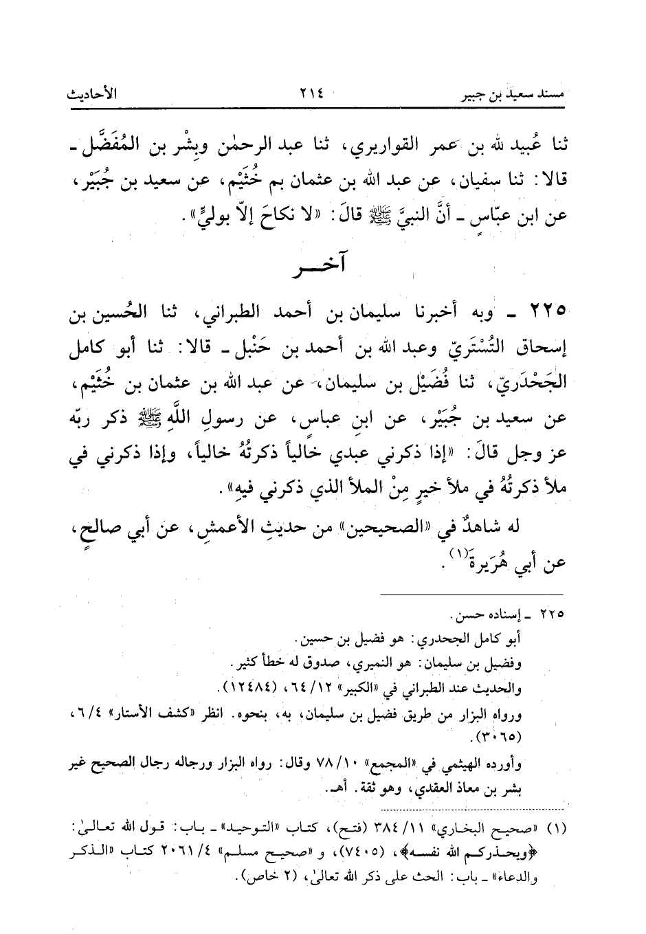 ٢٢٥ - وَبِهِ أَخْبَرَنَا سُلَيْمَانُ بْنُ أَحْمَدَ الطَّبَرَانِيُّ، ثَنَا الْحُسَيْنُ بْنُ إِسْحَاقَ التُّسْتَرِيُّ، وَعَبْدُ اللهِ بْنُ أَحْمَدَ بْنِ حَنْبَلٍ قَالَا: ثَنَا أَبُو كَامِلٍ الْجَحْدَرِيُّ، ثَنَا فُضَيْلُ بْنُ سُلَيْمَانَ، عَنْ عَبْدِ اللهِ بْنِ عُثْمَانَ بْنِ خُثَيْمٍ، عَنْ سَعِيدِ بْنِ جُبَيْرٍ، عَنِ ابْنِ عَبَّاسٍ، «عَنْ رَسُولِ اللهِ صَلَّى اللهُ عَلَيْهِ وَسَلَّمَ ذَكَرَ رَبَّهُ عَزَّ وَجَلَّ قَالَ: إِذَا ذَكَرَنِي عَبْدِي خَالِيًا ذَكَرْتُهُ خَالِيًا، وَإِذَا ذَكَرَنِي فِي مَلَأٍ ذَكَرْتُهُ فِي مَلَأٍ خَيْرٍ مِنَ الْمَلَأِ الَّذِي ذَكَرَنِي فِيهِ».