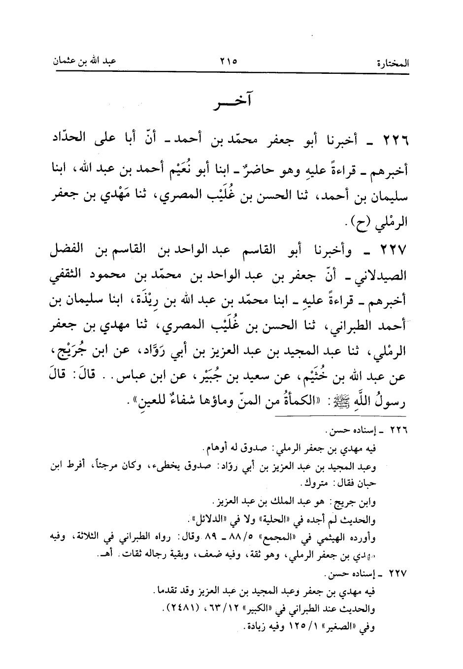٢٢٧ - وَأَخْبَرَنَا أَبُو الْقَاسِمِ عَبْدُ الْوَاحِدِ بْنُ الْقَاسِمِ بْنِ الْفَضْلِ الصَّيْدَلَانِيُّ، أَنَّ جَعْفَرَ بْنَ عَبْدِ الْوَاحِدِ بْنِ مُحَمَّدِ بْنِ مَحْمُودٍ الثَّقَفِيَّ أَخْبَرَهُمْ - قِرَاءَةً عَلَيْهِ - أَبْنَا مُحَمَّدُ بْنُ عَبْدِ اللهِ بْنِ رِيذَةَ، أَبْنَا سُلَيْمَانُ بْنُ أَحْمَدَ الطَّبَرَانِيُّ، ثَنَا الْحَسَنُ بْنُ غُلَيْبٍ الْمِصْرِيُّ، ثَنَا مَهْدِيُّ بْنُ جَعْفَرٍ الرَّمْلِيُّ، ثَنَا عَبْدُ الْمَجِيدِ بْنُ عَبْدِ الْعَزِيزِ بْنِ أَبِي رَوَّادٍ، عَنِ ابْنِ جُرَيْجٍ، عَنْ عَبْدِ اللهِ بْنِ خُثَيْمٍ، عَنْ سَعِيدِ بْنِ جُبَيْرٍ، عَنِ ابْنِ عَبَّاسٍ، قَالَ: قَالَ رَسُولُ اللهِ صَلَّى اللهُ عَلَيْهِ وَسَلَّمَ: «الْكَمْأَةُ مِنَ الْمَنِّ وَمَاؤُهَا شِفَاءٌ لِلْعَيْنِ.