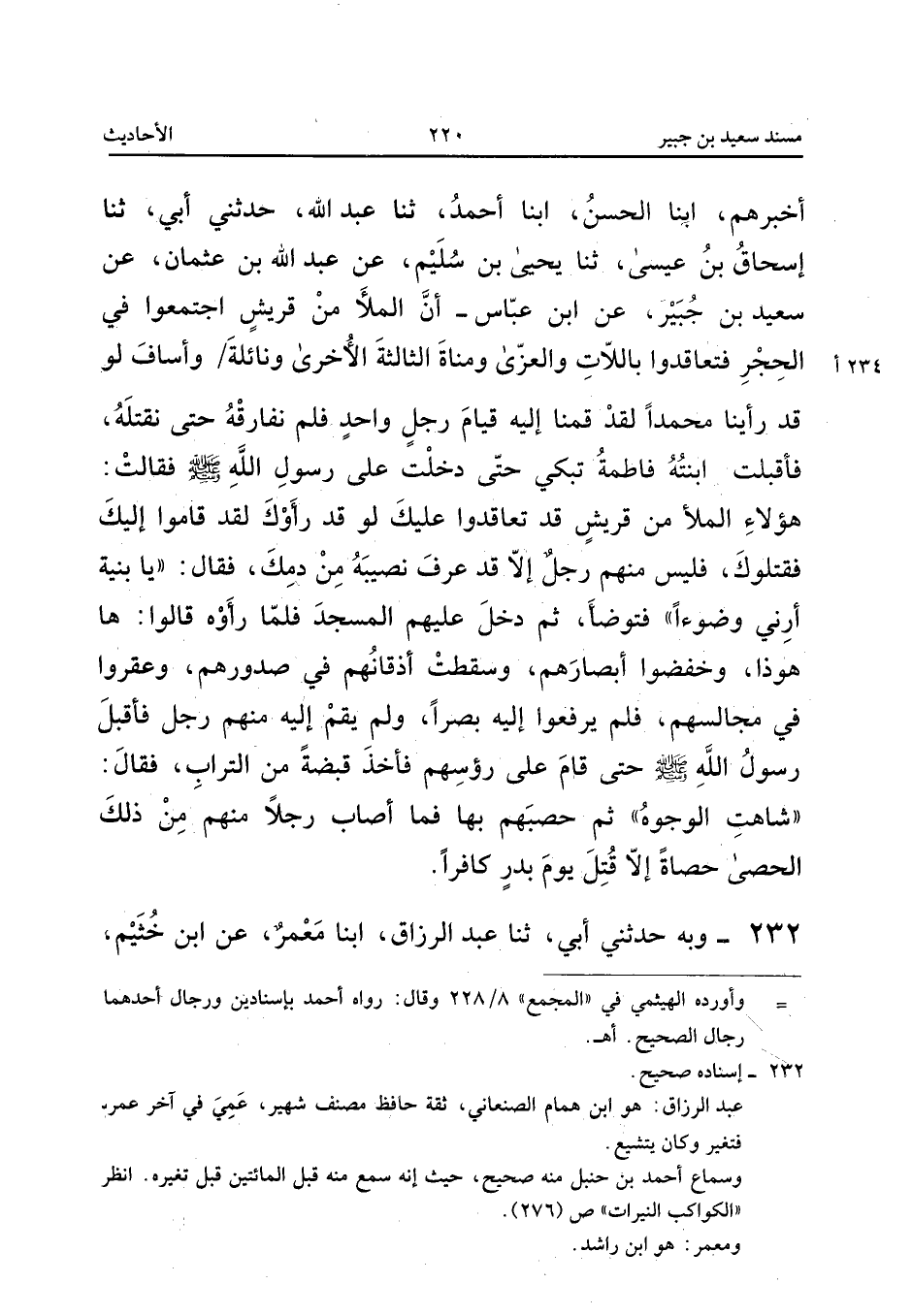 عَنْ سَعِيدِ بْنِ جُبَيْرٍ، عَنِ ابْنِ عَبَّاسٍ «أَنَّ الْمَلَأَ مِنْ قُرَيْشٍ اجْتَمَعُوا فِي الْحِجْرِ فَتَعَاهَدُوا بِاللَّاتِ وَالْعُزَّى وَمَنَاةَ الثَّالِثَةِ الْأُخْرَى، لَوْ قَدْ رَأَيْنَا مُحَمَّدًا قُمْنَا إِلَيْهِ قِيَامَ رَجُلٍ فَلَمْ نُفَارِقْهُ حَتَّى نَقْتُلَهُ، فَأَقْبَلَتْ فَاطِمَةُ تَبْكِي حَتَّى دَخَلَتْ عَلَى أَبِيهَا» ... فَذَكَرَ الْحَدِيثَ.