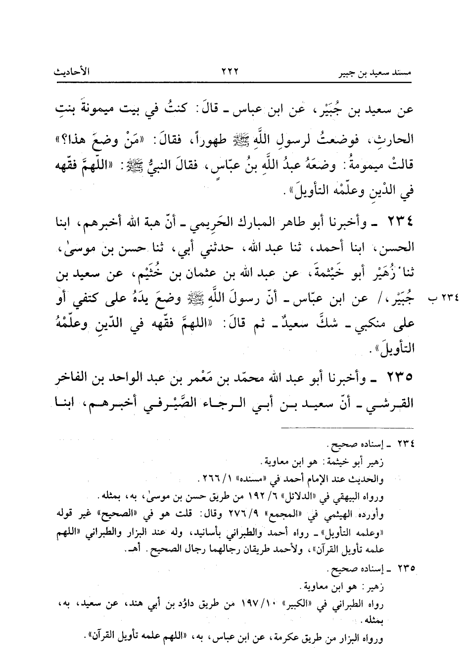 ٢٣٤ - وَأَخْبَرَنَا أَبُو طَاهِرٍ الْمُبَارَكُ الْحَرِيمِيُّ، أَنَّ هِبَةَ اللهِ أَخْبَرَهُمْ، أَبْنَا الْحَسَنُ، أَبْنَا أَحْمَدُ، ثَنَا عَبْدُ اللهِ، حَدَّثَنِي أَبِي، ثَنَا حَسَنُ بْنُ مُوسَى، ثَنَا زُهَيْرٌ أَبُو خَيْثَمَةَ، عَنْ عَبْدِ اللهِ بْنِ عُثْمَانَ بْنِ خُثَيْمٍ، عَنْ سَعِيدِ بْنِ جُبَيْرٍ، عَنِ ابْنِ عَبَّاسٍ «أَنَّ رَسُولَ اللهِ صَلَّى اللهُ عَلَيْهِ وَسَلَّمَ وَضَعَ يَدَهُ عَلَى كَتِفِي، أَوْ عَلَى مَنْكِبِي - شَكَّ سَعِيدٌ - ثُمَّ قَالَ: اللَّهُمَّ فَقِّهْهُ فِي الدِّينِ وَعَلِّمْهُ التَّأْوِيلَ».