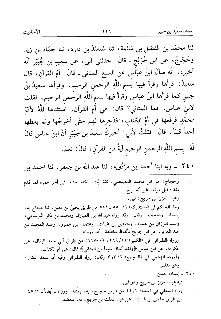 يُونُسَ، ثَنَا حَجَّاجُ بْنُ مُحَمَّدٍ، عَنِ ابْنِ جُرَيْجٍ قَالَ: أَخْبَرَنِي أَبِي أَنَّ سَعِيدَ بْنَ جُبَيْرٍ أَخْبَرَهُ، فَقَالَ: لَهُ: «{وَلَقَدْ آتَيْنَاكَ سَبْعًا مِنَ الْمَثَانِي} قَالَ: هِيَ أُمُّ الْقُرْآنِ، قَالَ أَبِي: فَقَرَأَهَا عَلَيَّ سَعِيدُ بْنُ جُبَيْرٍ {بِسْمِ اللهِ الرَّحْمَنِ الرَّحِيمِ} حَتَّى خَتَمَهَا، ثُمَّ قَالَ: {بِسْمِ اللهِ الرَّحْمَنِ الرَّحِيمِ} ... الْآيَةُ السَّابِعَةُ»، قَالَ سَعِيدُ بْنُ جُبَيْرٍ لِأَبِي: وَقَرَأَهَا عَلَيَّ ابْنُ عَبَّاسٍ كَمَا قَرَأْتُهَا عَلَيْكَ، فَقَالَ: {بِسْمِ اللهِ الرَّحْمَنِ الرَّحِيمِ} الْآيَةُ السَّابِعَةُ، قَالَ ابْنُ عَبَّاسٍ: فَدَخِرَهَا اللهُ لَكُمْ فَمَا أَخْرَجَهَا لِأَحَدٍ قَبْلَكُمْ.