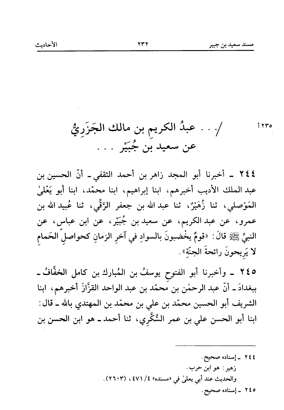 ٢٤٤ - أَخْبَرَنَا أَبُو الْمَجْدِ زَاهِرُ بْنُ أَحْمَدَ الثَّقَفِيُّ أَنَّ الْحُسَيْنَ بْنَ عَبْدِ الْمَلِكِ الْأَدِيبَ أَخْبَرَهُمْ، أَبْنَا إِبْرَاهِيمُ، أَبْنَا مُحَمَّدٌ، أَبْنَا أَبُو يَعْلَى الْمَوْصِلِيُّ، ثَنَا زُهَيْرٌ، ثَنَا عَبْدُ اللهِ بْنُ جَعْفَرٍ الرَّقِّيُّ، ثَنَا عُبَيْدُ اللهِ بْنُ عَمْرٍو، عَنْ عَبْدِ الْكَرِيمِ، عَنْ سَعِيدِ بْنِ جُبَيْرٍ، عَنِ ابْنِ عَبَّاسٍ، عَنِ النَّبِيِّ صَلَّى اللهُ عَلَيْهِ وَسَلَّمَ قَالَ: «قَوْمٌ يَخْضِبُونَ بِالسَّوَادِ فِي آخِرِ الزَّمَانِ كَحَوَاصِلِ الْحَمَامِ لَا يَرِيحُونَ رَائِحَةَ الْجَنَّةِ».
