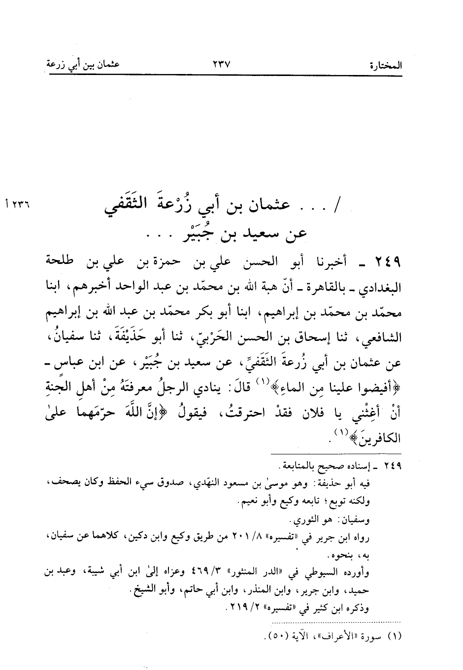 ٢٤٩ - أَخْبَرَنَا أَبُو الْحَسَنِ عَلِيُّ بْنُ حَمْزَةَ بْنِ عَلِيِّ بْنِ طَلْحَةَ الْبَغْدَادِيُّ - بِالْقَاهِرَةِ - أَنَّ هِبَةَ اللهِ بْنَ مُحَمَّدِ بْنِ عَبْدِ الْوَاحِدِ أَخْبَرَهُمْ، أَبْنَا مُحَمَّدُ بْنُ مُحَمَّدِ بْنِ إِبْرَاهِيمَ، أَبْنَا أَبُو بَكْرٍ مُحَمَّدُ بْنُ عَبْدِ اللهِ بْنِ إِبْرَاهِيمَ الشَّافِعِيُّ، ثَنَا إِسْحَاقُ بْنُ الْحَسَنِ الْحَرْبِيُّ، ثَنَا أَبُو حُذَيْفَةَ، ثَنَا سُفْيَانُ، عَنْ عُثْمَانَ بْنِ أَبِي زُرْعَةَ الثَّقَفِيِّ، عَنْ سَعِيدِ بْنِ جُبَيْرٍ، عَنِ ابْنِ عَبَّاسٍ: «{أَفِيضُوا عَلَيْنَا مِنَ الْمَاءِ} قَالَ: يُنَادِي الرَّجُلُ مَعْرِفَتَهُ مِنْ أَهْلِ الْجَنَّةِ أَنْ أَغِثْنِي يَا فُلَانُ فَقَدِ احْتَرَقْتُ، فَيَقُولُ: {إِنَّ اللهَ حَرَّمَهُمَا عَلَى الْكَافِرِينَ}».