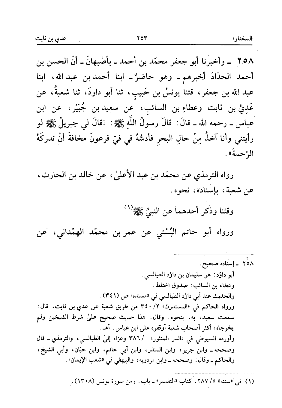 ٢٥٨ - وَأَخْبَرَنَا أَبُو جَعْفَرٍ مُحَمَّدُ بْنُ أَحْمَدَ - بِأَصْبَهَانَ - أَنَّ الْحَسَنَ بْنَ أَحْمَدَ الْحَدَّادَ أَخْبَرَهُمْ وَهُوَ حَاضِرٌ، أَبْنَا أَحْمَدُ بْنُ عَبْدِ اللهِ، أَبْنَا عَبْدُ اللهِ بْنُ جَعْفَرٍ، قَثَنَا يُونُسُ بْنُ حَبِيبٍ، ثَنَا أَبُو دَاوُدَ، ثَنَا شُعْبَةُ، عَنْ عَدِيِّ بْنِ ثَابِتٍ وَعَطَاءِ بْنِ السَّائِبِ، عَنْ سَعِيدِ بْنِ جُبَيْرٍ، عَنِ ابْنِ عَبَّاسٍ رَحِمَهُ اللهُ، قَالَ: قَالَ رَسُولُ اللهِ صَلَّى اللهُ عَلَيْهِ وَسَلَّمَ: «قَالَ لِي جِبْرِيلُ صَلَّى اللهُ عَلَيْهِ وَسَلَّمَ: لَوْ رَأَيْتَنِي وَأَنَا آخُذُ مِنْ حَالِ الْبَحْرِ فَأَدُسُّهُ فِي فِي فِرْعَوْنَ مَخَافَةَ أَنْ تُدْرِكَهُ الرَّحْمَةُ».