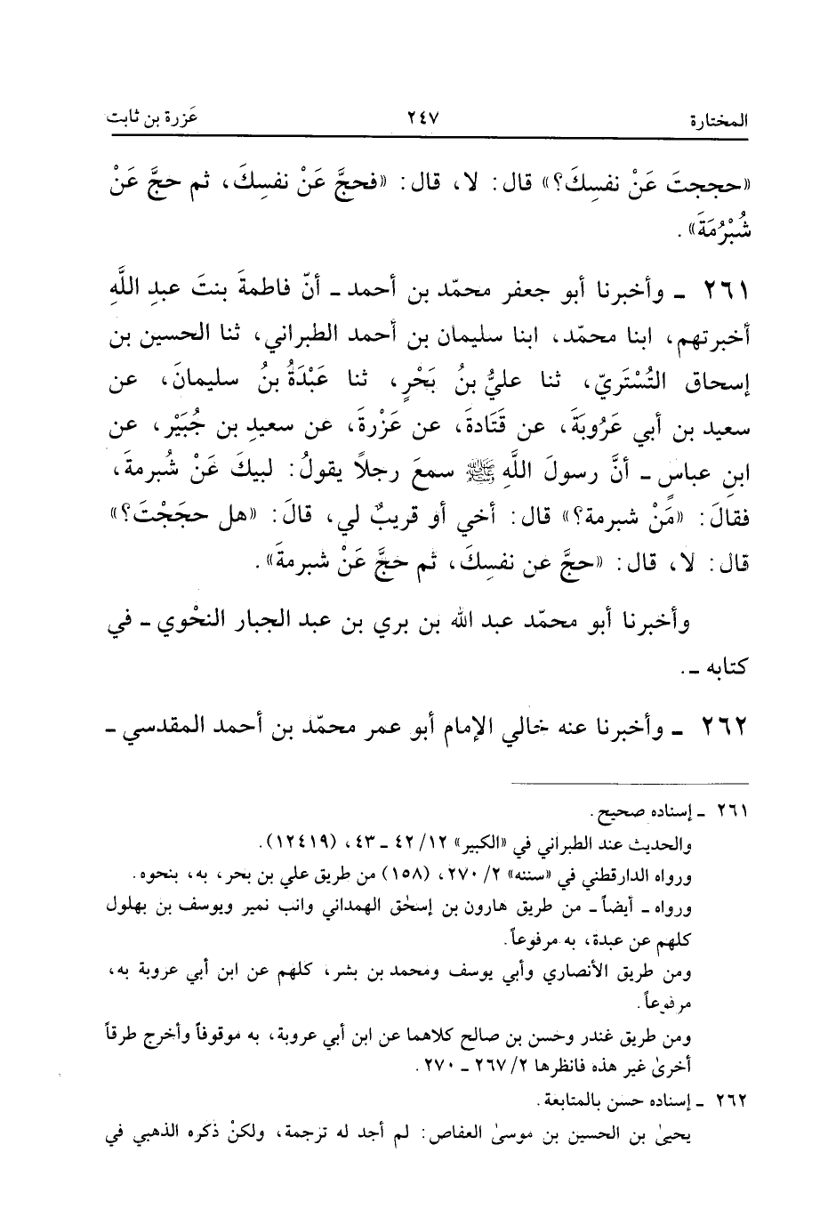 ٢٦١ - وَأَخْبَرَنَا أَبُو جَعْفَرٍ مُحَمَّدُ بْنُ أَحْمَدَ أَنَّ فَاطِمَةَ بِنْتَ عَبْدِ اللهِ أَخْبَرَتْهُمْ، أَبْنَا مُحَمَّدٌ، أَبْنَا سُلَيْمَانُ بْنُ أَحْمَدَ الطَّبَرَانِيُّ، ثَنَا الْحُسَيْنُ بْنُ إِسْحَاقَ التُّسْتَرِيُّ، ثَنَا عَلِيُّ بْنُ بَحْرٍ، ثَنَا عَبْدَةُ بْنُ سُلَيْمَانَ، عَنْ سَعِيدِ بْنِ أَبِي عَرُوبَةَ، عَنْ قَتَادَةَ، عَنْ عَزْرَةَ، عَنْ سَعِيدِ بْنِ جُبَيْرٍ، عَنِ ابْنِ عَبَّاسٍ «أَنَّ رَسُولَ اللهِ صَلَّى اللهُ عَلَيْهِ وَسَلَّمَ سَمِعَ رَجُلًا يَقُولُ: لَبَّيْكَ عَنْ شُبْرُمَةَ، فَقَالَ: مَنْ شُبْرُمَةُ؟ قَالَ: أَخِي أَوْ قَرِيبٌ لِي، قَالَ: هَلْ حَجَجْتَ؟ قَالَ: لَا، قَالَ: حُجَّ عَنْ نَفْسِكَ، ثُمَّ حُجَّ عَنْ شُبْرُمَةَ.»