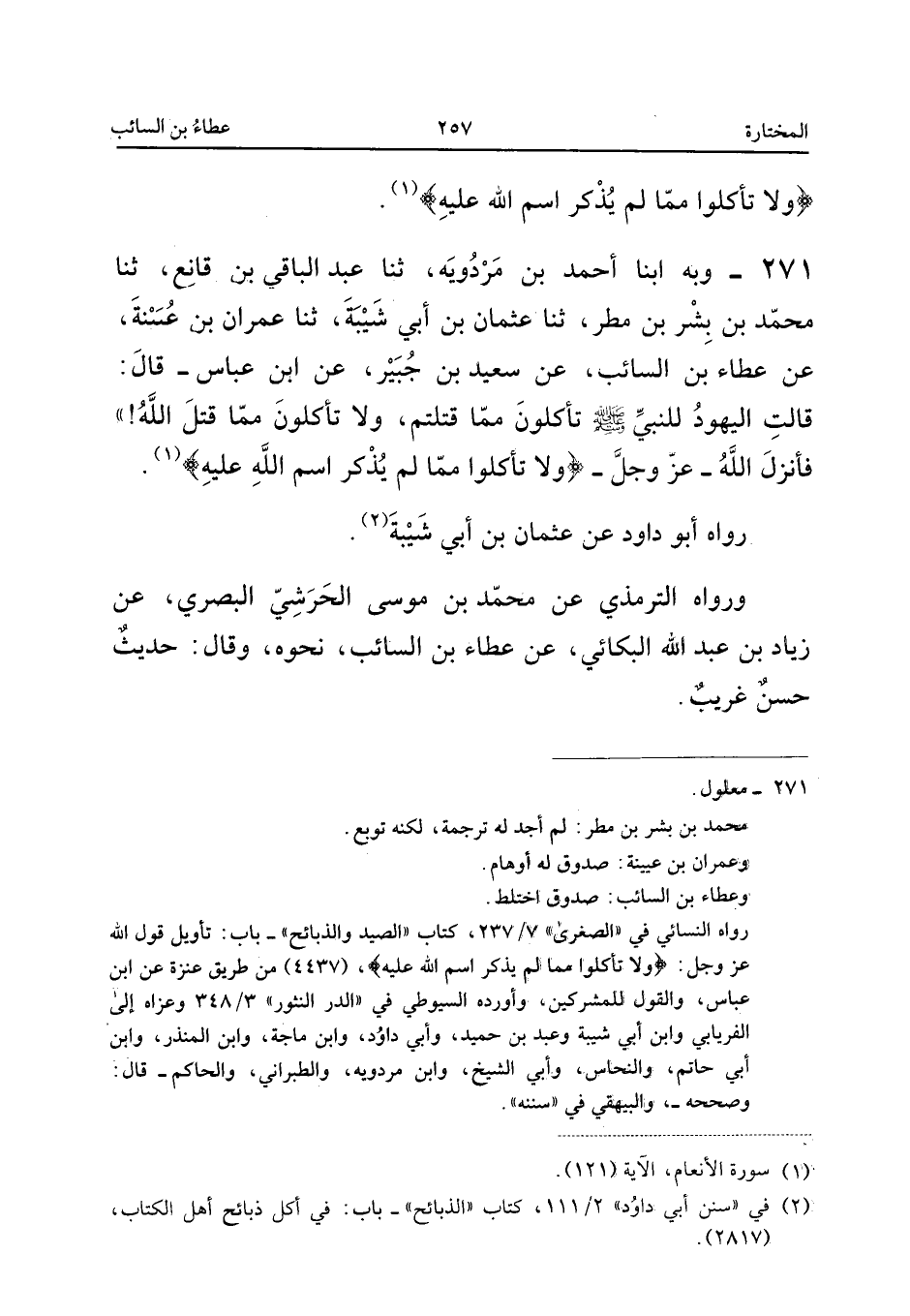٢٧١ - وَبِهِ، أَبْنَا أَحْمَدُ بْنُ مَرْدُوَيْهِ، ثَنَا عَبْدُ الْبَاقِي بْنُ قَانِعٍ، ثَنَا مُحَمَّدُ بْنُ بِشْرِ بْنِ مَطَرٍ، ثَنَا عُثْمَانُ بْنُ أَبِي شَيْبَةَ، ثَنَا عِمْرَانُ بْنُ عُيَيْنَةَ، عَنْ عَطَاءِ بْنِ السَّائِبِ، عَنْ سَعِيدِ بْنِ جُبَيْرٍ، عَنِ ابْنِ عَبَّاسٍ قَالَ: «قَالَتِ الْيَهُودُ لِلنَّبِيِّ صَلَّى اللهُ عَلَيْهِ وَسَلَّمَ: تَأْكُلُونَ مِمَّا قَتَلْتُمْ، وَلَا تَأْكُلُونَ مِمَّا قَتَلَ اللهُ، فَأَنْزَلَ اللهُ عَزَّ وَجَلَّ: {وَلا تَأْكُلُوا مِمَّا لَمْ يُذْكَرِ اسْمُ اللهِ عَلَيْهِ}».