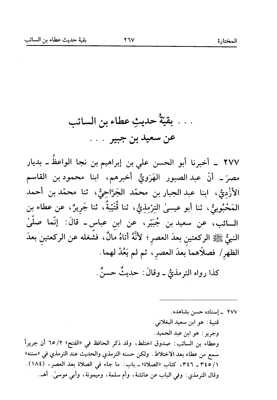 ٢٧٧ - أَخْبَرَنَا أَبُو الْحَسَنِ عَلِيُّ بْنُ إِبْرَاهِيمَ بْنِ نَجَا الْوَاعِظُ - بِدِيَارِ مِصْرَ - أَنَّ عَبْدَ الصَّبُورِ الْهَرَوِيَّ أَخْبَرَهُمْ، أَبْنَا مَحْمُودُ بْنُ الْقَاسِمِ الْأَزْدِيُّ، أَبْنَا عَبْدُ الْجَبَّارِ بْنُ مُحَمَّدٍ الْجَرَّاحِيُّ، ثَنَا مُحَمَّدُ بْنُ أَحْمَدَ الْمَحْبُوبِيُّ، ثَنَا أَبُو عِيسَى التِّرْمِذِيُّ، ثَنَا قُتَيْبَةُ، ثَنَا جَرِيرٌ، عَنْ عَطَاءِ بْنِ السَّائِبِ، عَنْ سَعِيدِ بْنِ جُبَيْرٍ، عَنِ ابْنِ عَبَّاسٍ قَالَ: «إِنَّمَا صَلَّى النَّبِيُّ صَلَّى اللهُ عَلَيْهِ وَسَلَّمَ الرَّكْعَتَيْنِ بَعْدَ الْعَصْرِ؛ لِأَنَّهُ أَتَاهُ مَالٌ فَشَغَلَهُ عَنِ الرَّكْعَتَيْنِ بَعْدَ الظُّهْرِ فَصَلَّاهُمَا بَعْدَ الْعَصْرِ، ثُمَّ لَمْ يَعُدْ لَهُمَا».