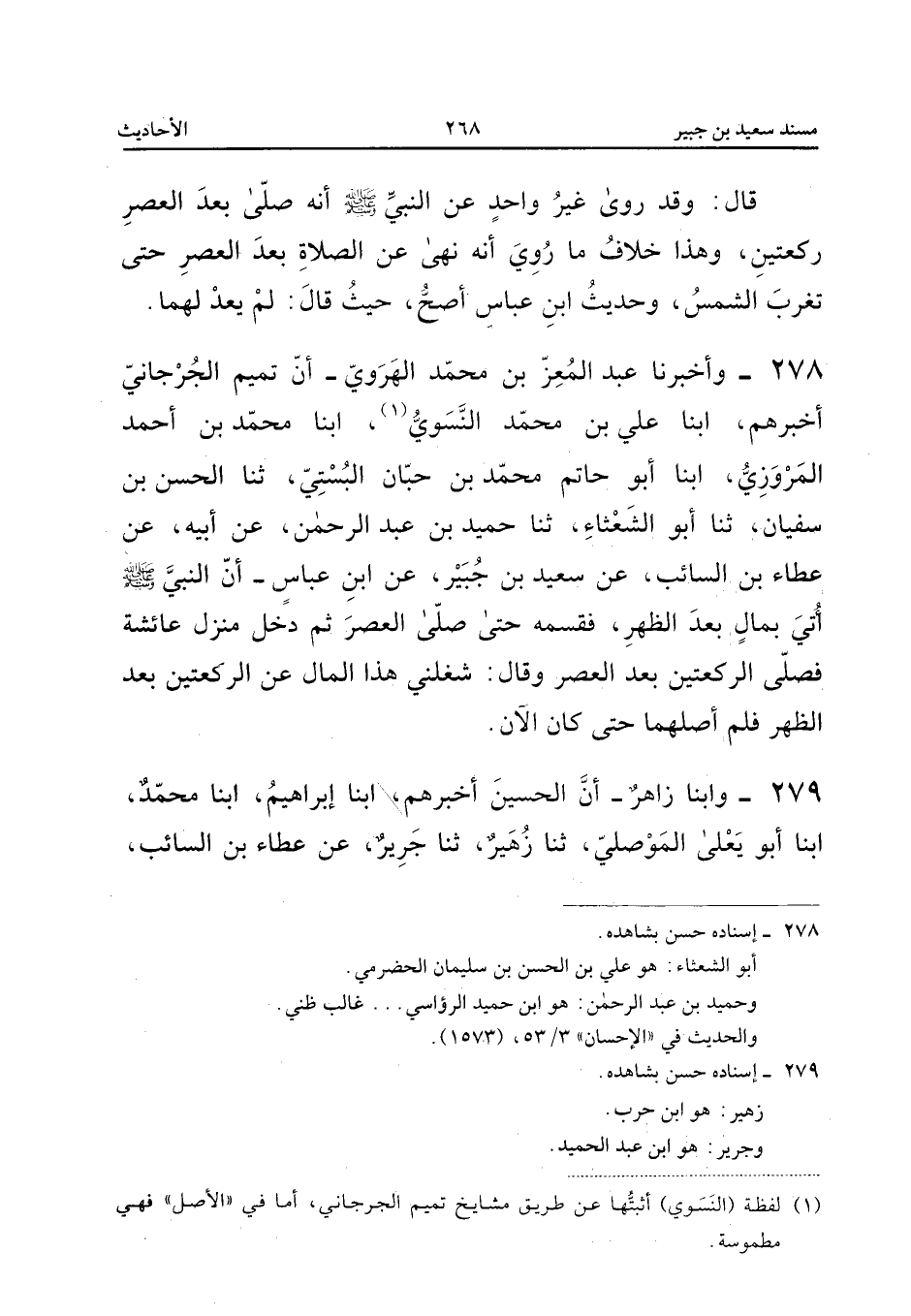 ٢٧٨ - وَأَخْبَرَنَا عَبْدُ الْمُعِزِّ بْنُ مُحَمَّدٍ الْهَرَوِيُّ أَنَّ تَمِيمًا الْجُرْجَانِيَّ أَخْبَرَهُمْ، أَبْنَا عَلِيُّ بْنُ مُحَمَّدٍ النَّسَوِيُّ، أَبْنَا مُحَمَّدُ بْنُ أَحْمَدَ الْمَرْوَزِيُّ، أَبْنَا أَبُو حَاتِمٍ مُحَمَّدُ بْنُ حَبَّانَ الْبُسْتِيُّ، ثَنَا الْحَسَنُ بْنُ سُفْيَانَ، ثَنَا أَبُو الشَّعْثَاءِ، ثَنَا حُمَيْدُ بْنُ عَبْدِ الرَّحْمَنِ، عَنْ أَبِيهِ، عَنْ عَطَاءِ بْنِ السَّائِبِ، عَنْ سَعِيدِ بْنِ جُبَيْرٍ، عَنِ ابْنِ عَبَّاسٍ «أَنَّ النَّبِيَّ صَلَّى اللهُ عَلَيْهِ وَسَلَّمَ أُتِيَ بِمَالٍ بَعْدَ الظُّهْرِ، فَقَسَّمَهُ حَتَّى صَلَّى الْعَصْرَ، ثُمَّ دَخَلَ مَنْزِلَ عَائِشَةَ فَصَلَّى الرَّكْعَتَيْنِ بَعْدَ الْعَصْرِ، وَقَالَ: شَغَلَنِي هَذَا الْمَالُ عَنِ الرَّكْعَتَيْنِ بَعْدَ الظُّهْرِ فَلَمْ أُصَلِّهِمَا حَتَّى كَانَ الْآنَ».